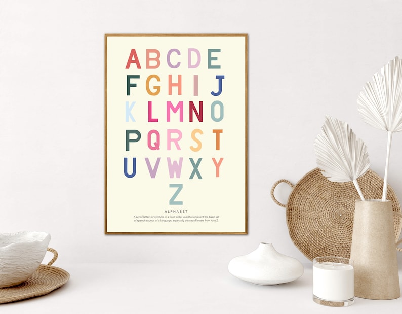 Çocuk odalarına hem 🎨 renk hem de 📚 öğrenme keyfi katacak Alfabe ABC Çocuk Odası Tablosu ile minikler eğlenerek harfleri öğreniyor! 👶✨Ürünümüz Çerçevelidir. Çerçeve Rengi Olarak beyaz ve ham ahşap rengi seçenekleri mevcuttur.
