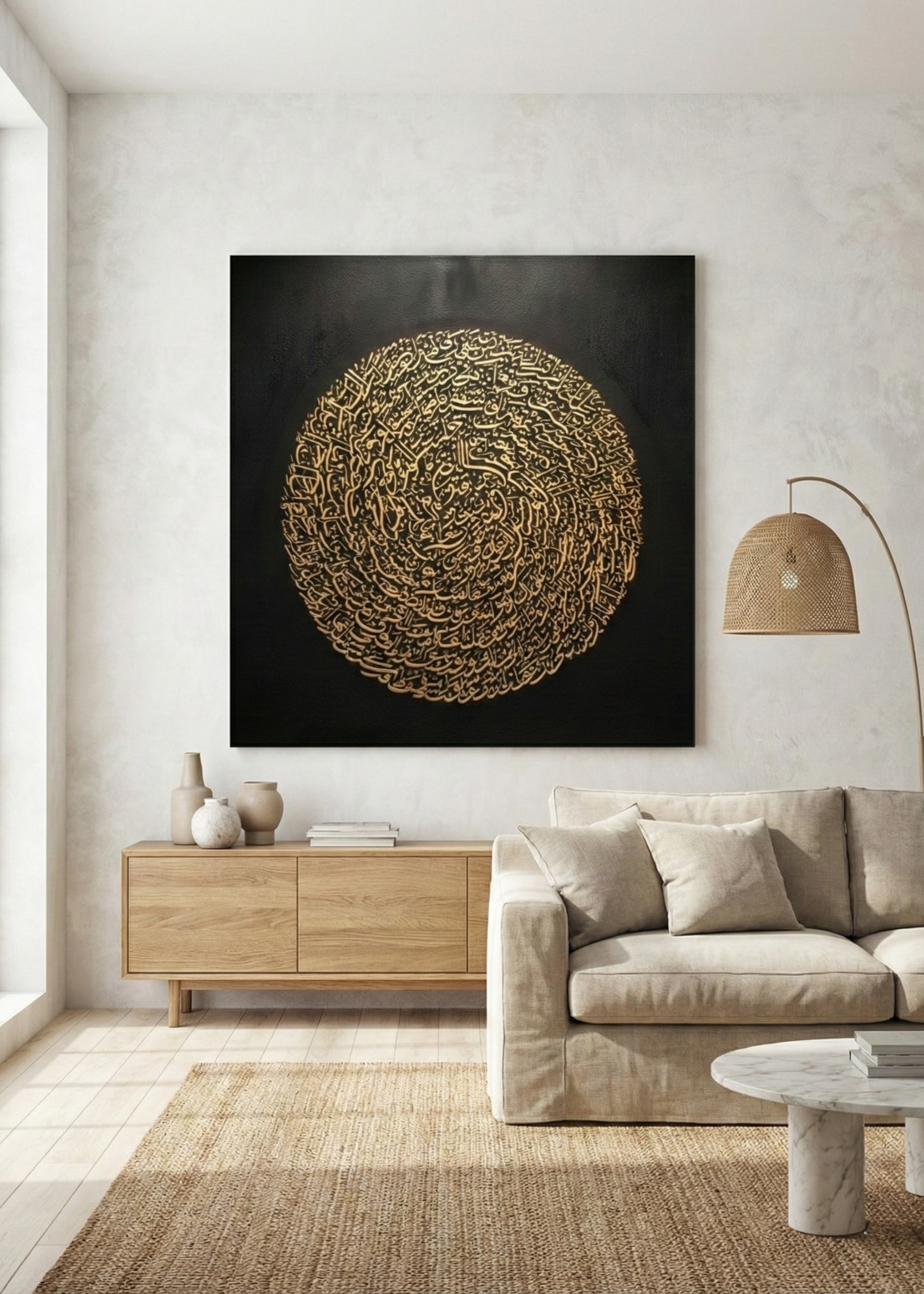 Altın tonlu Arapça hat sanatı kanvas tablo siyah zemin üzerindeki dairesel kompozisyonu ile yaşam alanlarına güçlü ve manevi bir atmosfer kazandırır.Modern İslami sanat anlayışıyla tasarlanan bu dini kanvas tablo salon oturma odası ofis ve ibadet alanlarında şık bir duvar dekoru olarak öne çıkar.Yüksek çözünürlüklü baskı tekniği ile üretilmiş olup renk canlılığını uzun süre korur.Kanvas tablo ahşap şaseye gerili şekilde duvara asıma hazır olarak gönderilir.Manevi anlamı ve estetik duruşu sayesinde yeni ev hediyesi dini hediye ve özel günler için ideal bir seçimdir.