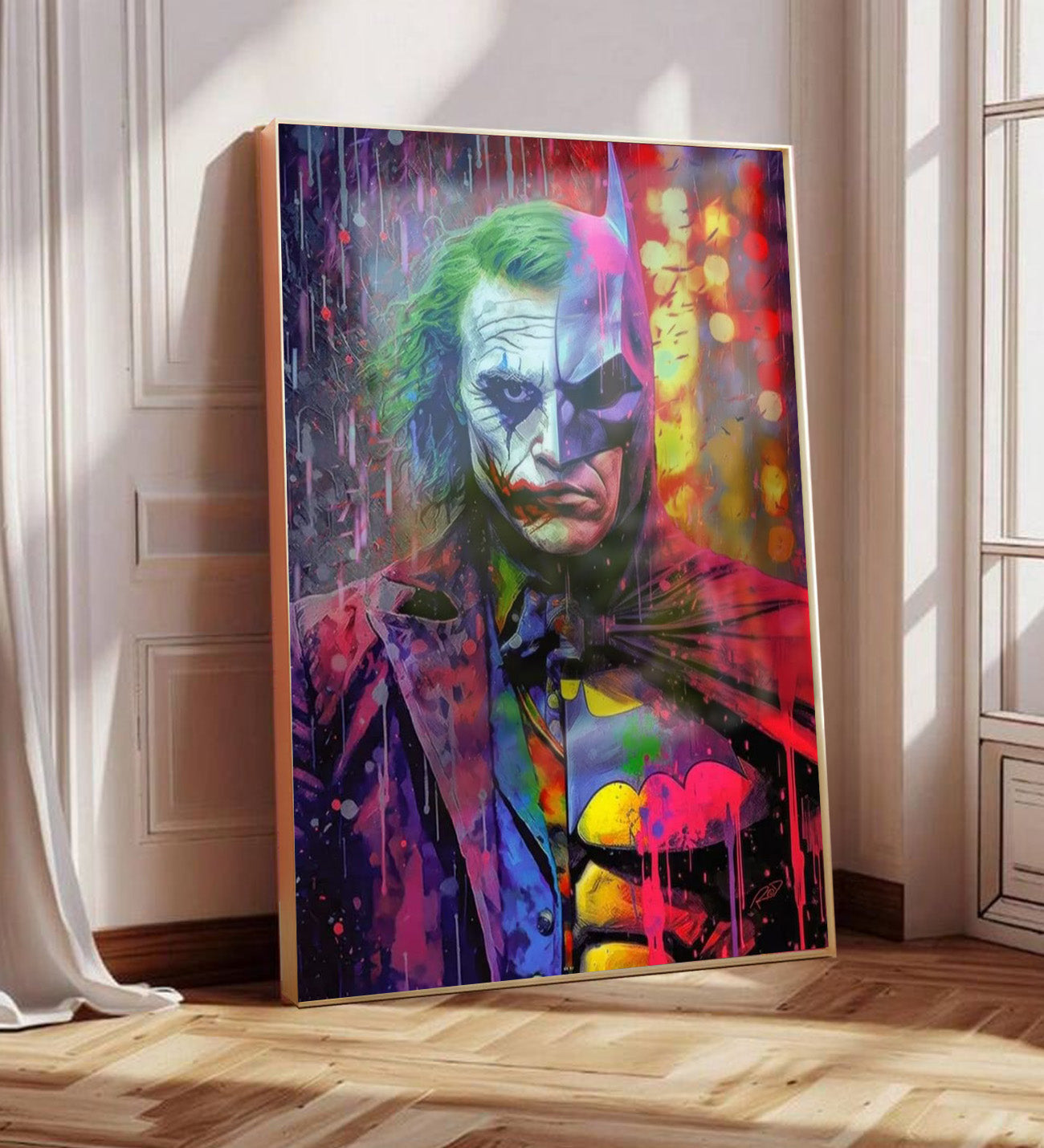 Neon renklerin enerjisini, iki ezeli karakterin (🦇 & 🃏) çarpıcı kompozisyonuyla birleştiren bu Pop Art tasarım; salon, ofis, genç/oyun odası ve kafe gibi alanlarda güçlü bir odak noktası yaratır. Soyut boya sıçramaları, graffiti dokusu ve yüksek kontrast, duvarda galerilik etki verir. Hediyelik olarak da mükemmel! ⚡️