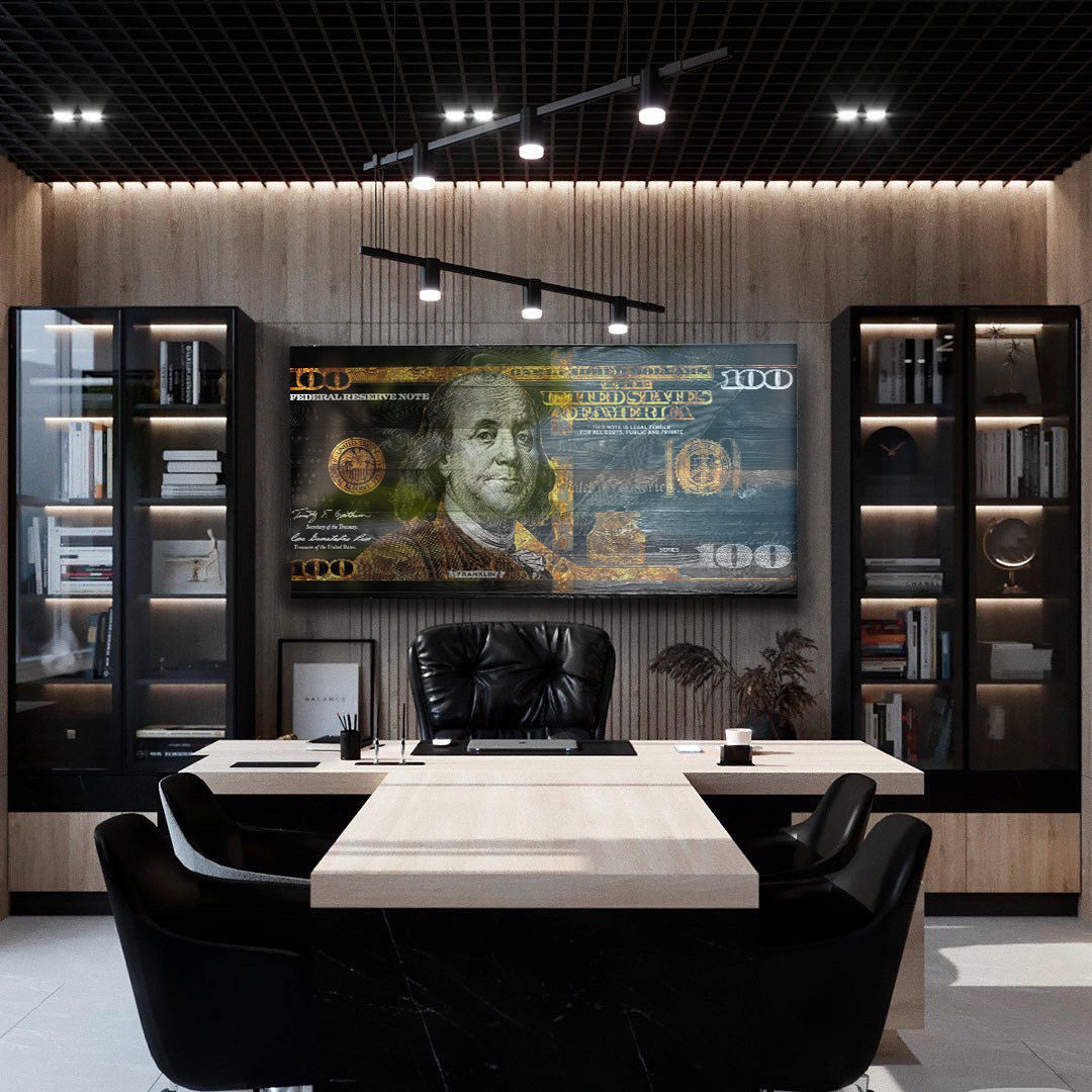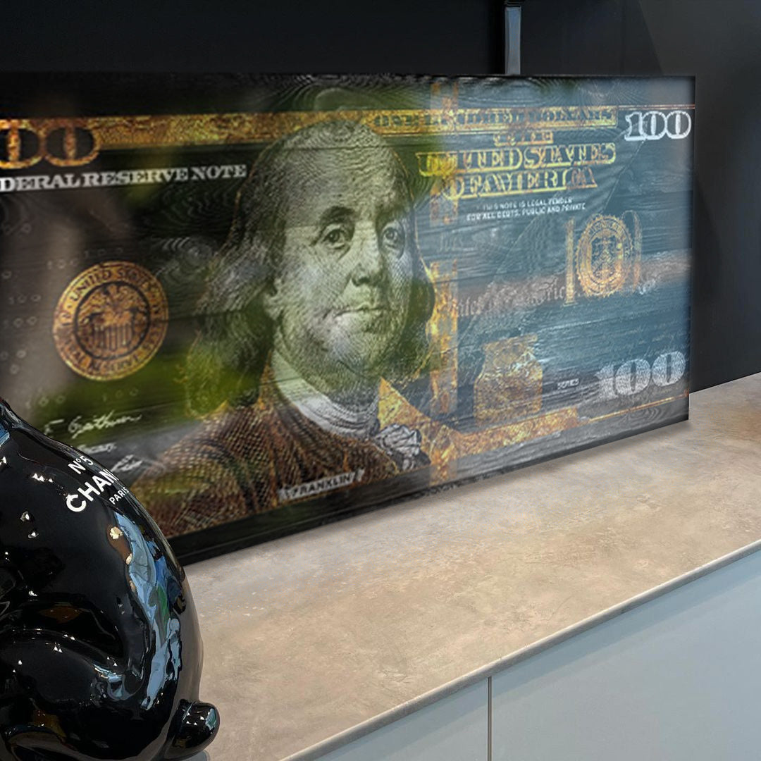 Prestij ve zenginlik sembolü olan 100 Amerikan Doları tasarımının modern bir yorumu, altın detaylarla hazırlanmış bu özel tabloya yansıtıldı. Ortasında ABD’nin kurucu babalarından Benjamin Franklin portresi bulunan tablo, şıklığı ve güçlü duruşuyla özellikle ofis ve iş ortamlarına lüks bir hava katıyor.