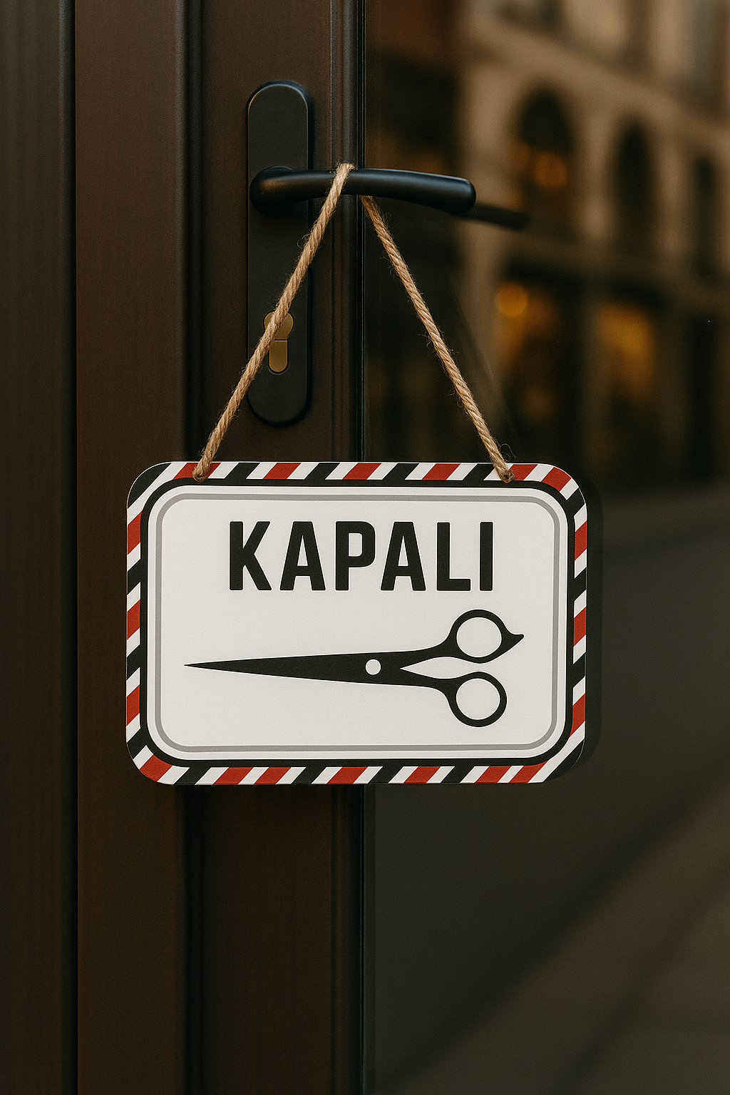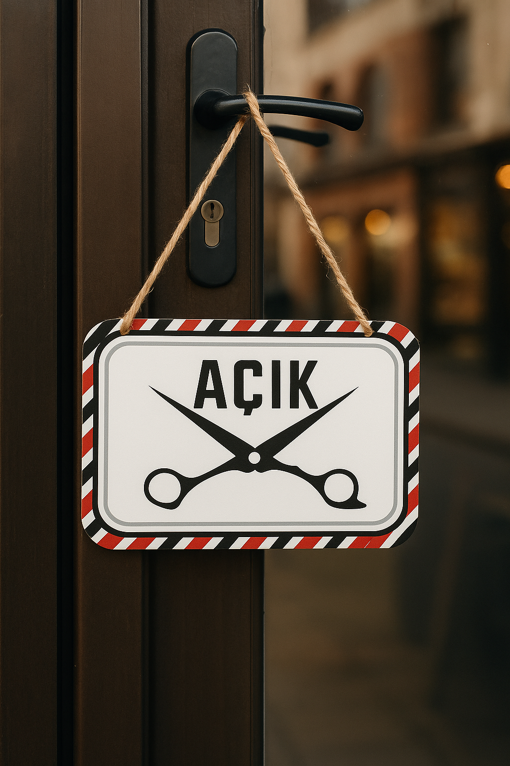 Berber Açık Kapalı Tabelası, kuaför ve berber dükkanlarında profesyonel bir görünüm kazandırmak için tasarlanmıştır. 15x22 cm ölçülerindeki bu çift taraflı kapı levhası, bir yüzü “Açık” diğer yüzü “Kapalı” ibaresiyle kolay kullanım sağlar. Şık makas deseni ve kırmızı-siyah çerçeve tasarımıyla berber konseptine mükemmel uyum sunar. Dayanıklı malzemeden üretilmiş olup iç ve dış mekanda uzun süre kullanılabilir. Askı ipi sayesinde kapı koluna veya vitrine kolayca asılır. Berber, kuaför, güzellik salonu, tıraş dükkânı ve işletmeler için pratik ve dekoratif bir çözüm sunar. Müşterilerinize açık mı kapalı mı olduğunuzu kolayca göstermek için ideal bir tabeladır.