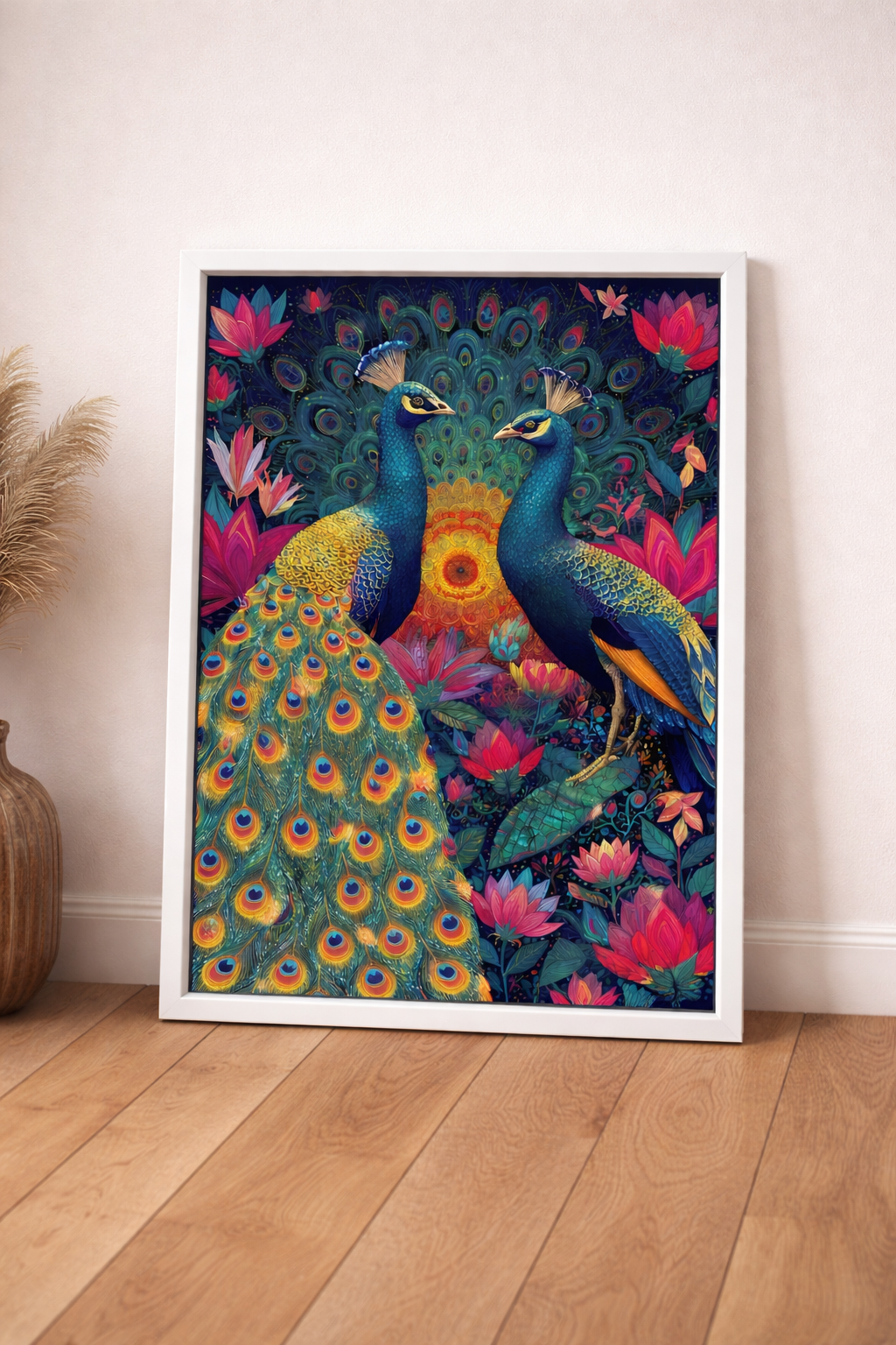 Evinize sanatsal bir zarafet ve renklerin enerjisini taşımaya hazır mısınız? Dekor Paleti tarafından özenle hazırlanan bu özel tasarım; asaletin sembolü tavus kuşlarını, egzotik çiçeklerin büyüleyici renkleriyle buluşturuyor. Beyaz çerçeve şıklığıyla sunulan bu tablo, her türlü iç mekan stiline anında modern ve sofistike bir dokunuş katar.
