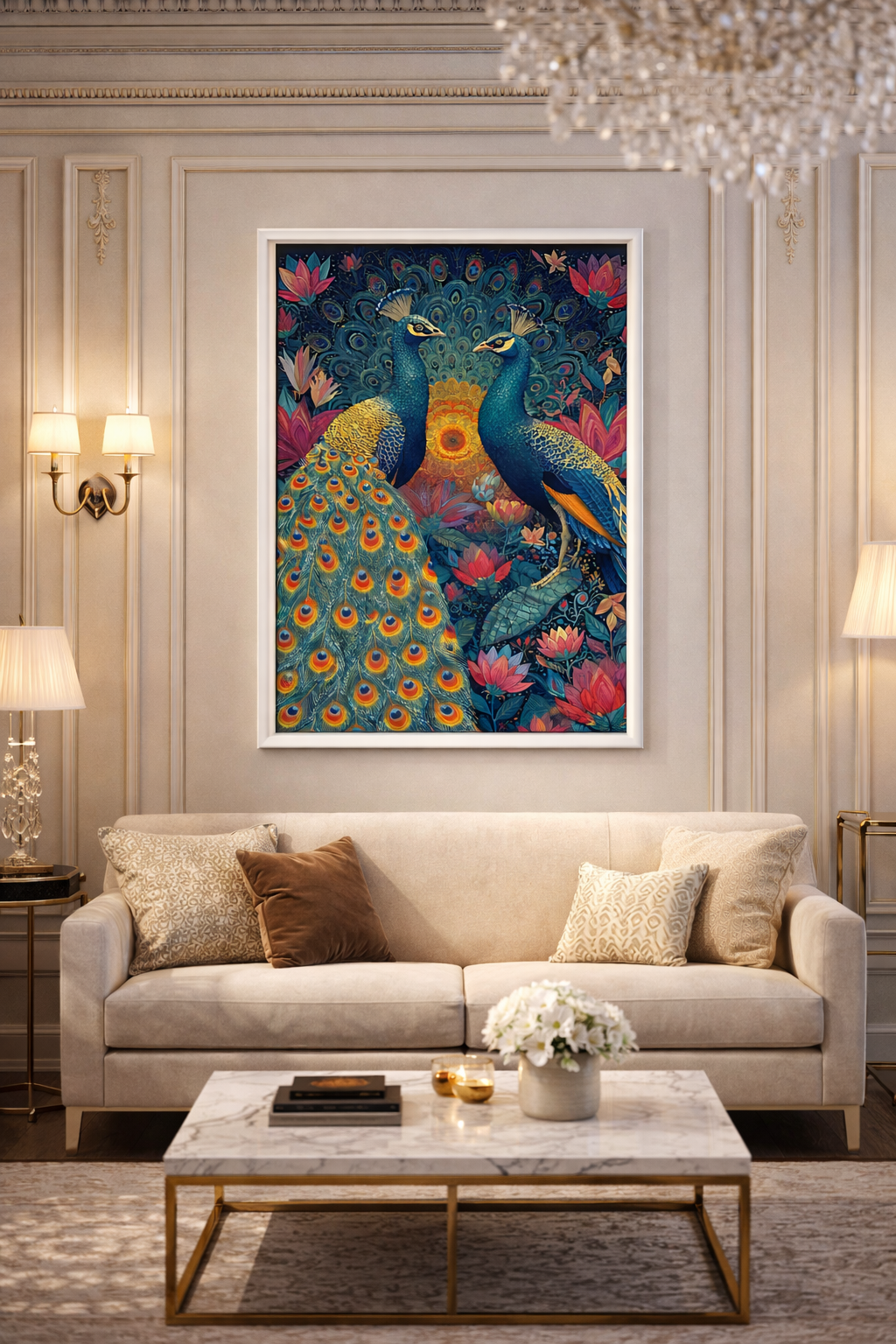 Sanatsal Detaylar: Tavus kuşlarının görkemli kuyruk desenleri ve zeminindeki çiçek motifleri, her bakışta yeni bir detay keşfetmenizi sağlar.