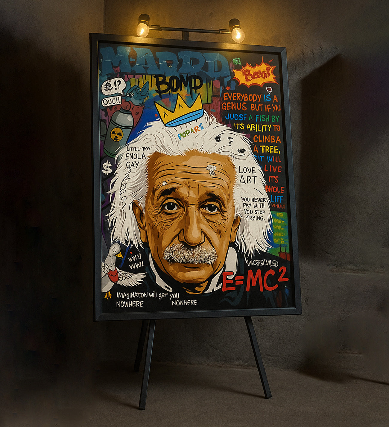 This special design features a striking portrait of Albert Einstein, blending pop art and graffiti touches, on a wooden surface. Produced using high-quality printing techniques, the image blends seamlessly with the wood's natural texture for a warm and aesthetically pleasing look. From industrial to modern decor, this painting blends seamlessly into any space, making it both artistic and inspiring. Suitable for hanging on a wall or displaying on a stand, it adds a unique energy to your living spaces.