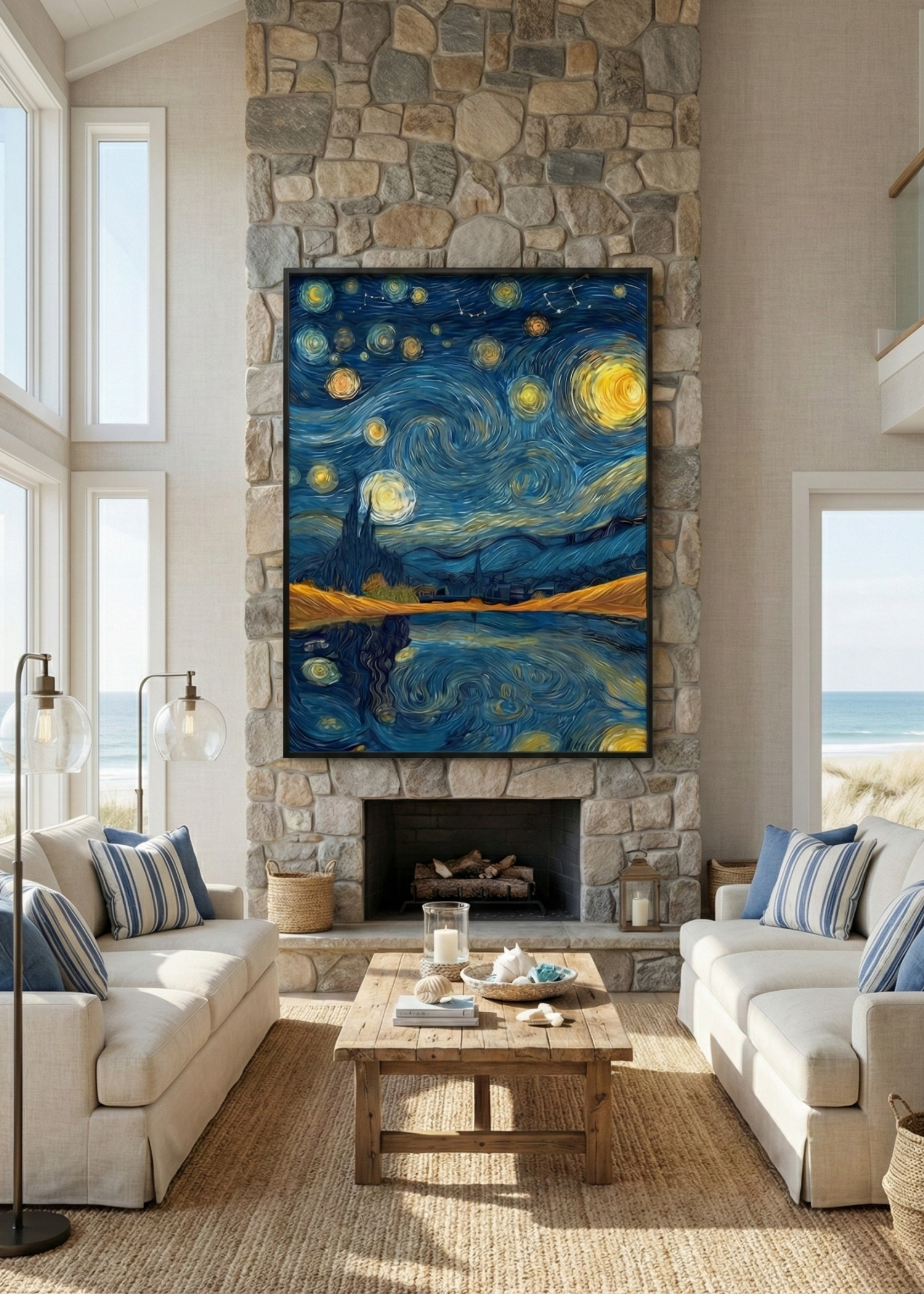 Gece gökyüzünden ilham alan bu çerçeveli tablo, dönen fırça dokuları ve derin renk geçişleriyle yaşam alanlarına sanatsal bir atmosfer kazandırır. Modern ve klasik dekorasyon stilleriyle uyumlu tasarımı sayesinde salon, oturma odası, ofis ve çalışma alanlarında şık bir tamamlayıcı olarak tercih edilebilir.
