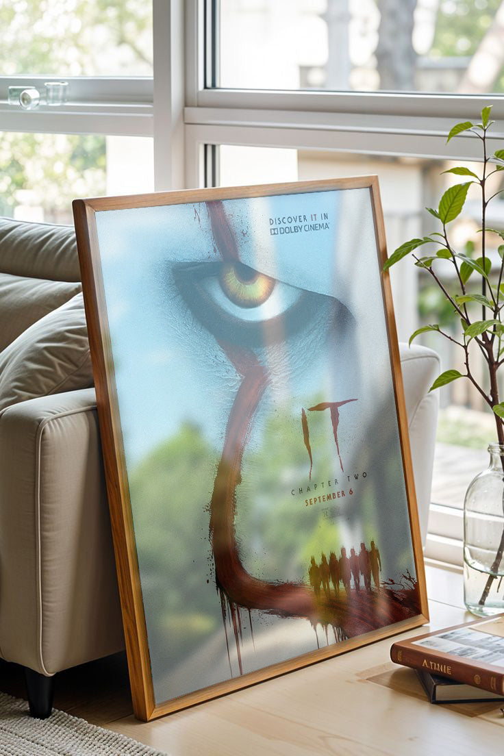 Stephen King’in ünlü romanından uyarlanan ve sinema dünyasında büyük ses getiren IT: Chapter Two filminin afiş tasarımı, özel baskı tabloya dönüştürüldü. Pennywise’ın ürkütücü bakışını öne çıkaran bu tasarım, korku ve gerilim severler için eşsiz bir dekoratif parça.
