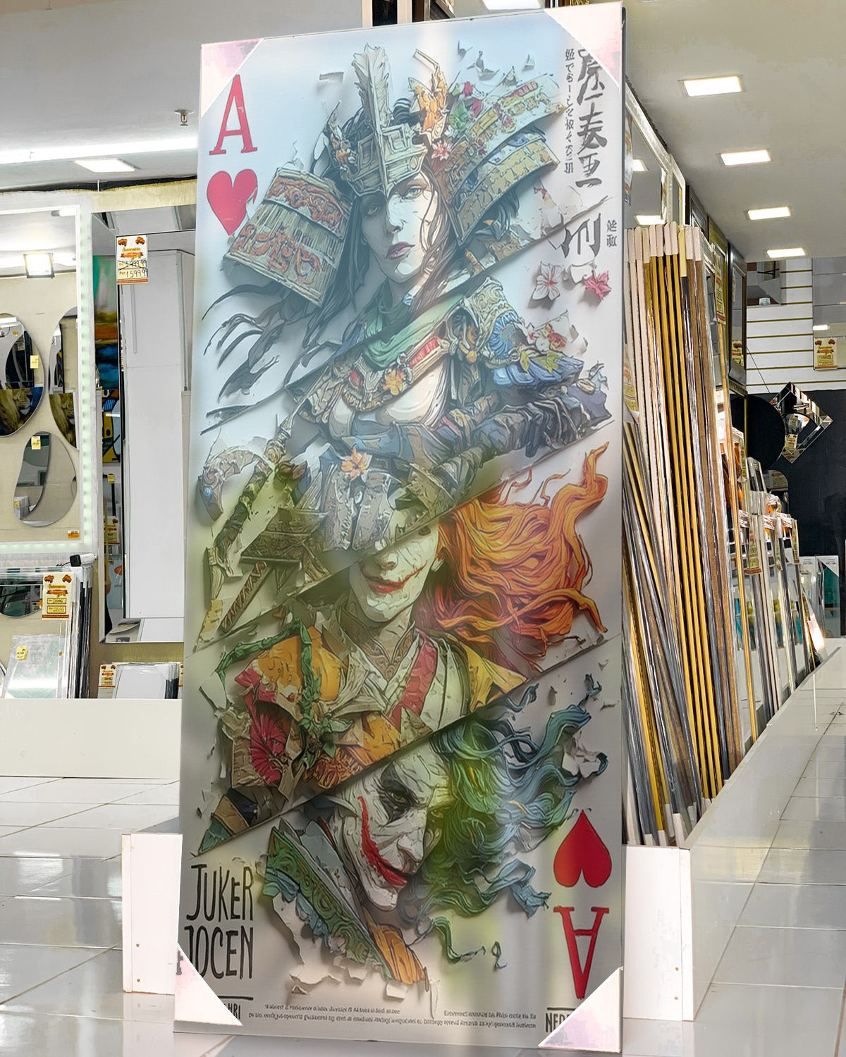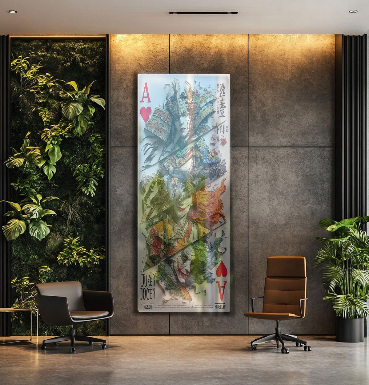 Oyun kartlarının estetiğini ve popüler kültür ikonlarını birleştiren bu özel tablo, Kraliçe (Queen) figürü ile Joker karakterini samuray temasıyla yeniden yorumluyor. Canlı renkler, ince detaylar ve güçlü çizgilerle hazırlanan tasarım, modern dekorasyona hem sanatsal hem de sıra dışı bir dokunuş katıyor.