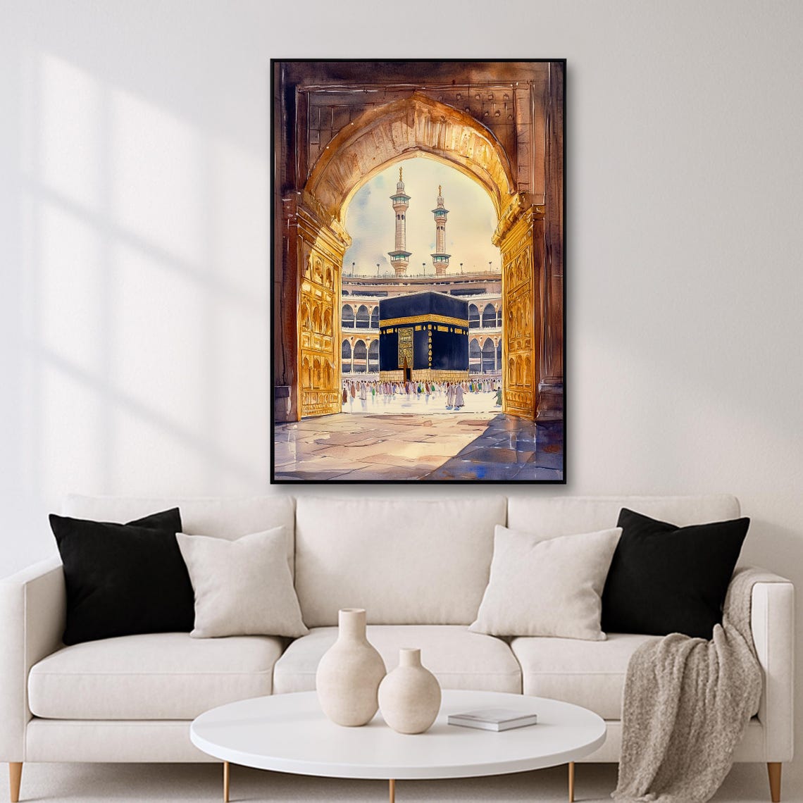 Evinize ve iş yerinize huzur katacak, İslam’ın kalbi Kâbe’nin eşsiz manzarasını yansıtan bu özel tablo, manevi atmosferi ile dekorasyonunuza anlam kazandırır. Altın kapı detaylarıyla çerçevelenen Kâbe görseli, Mescid-i Haram’ın ihtişamını sanatsal bir dokunuşla evinize taşır.