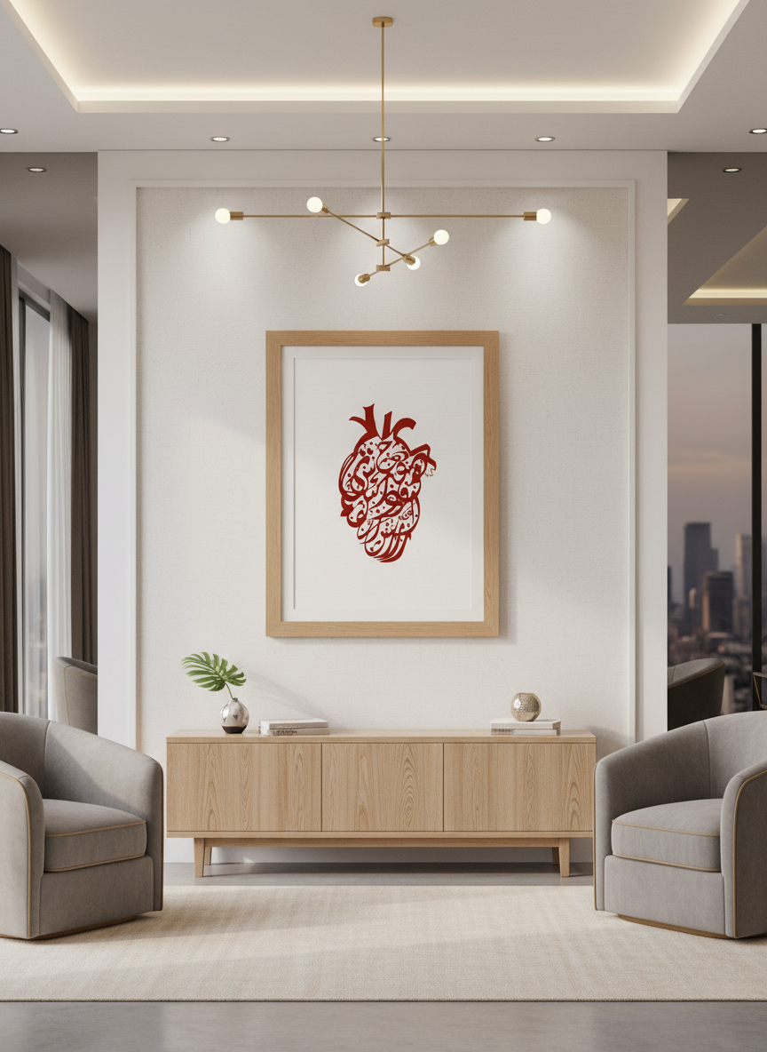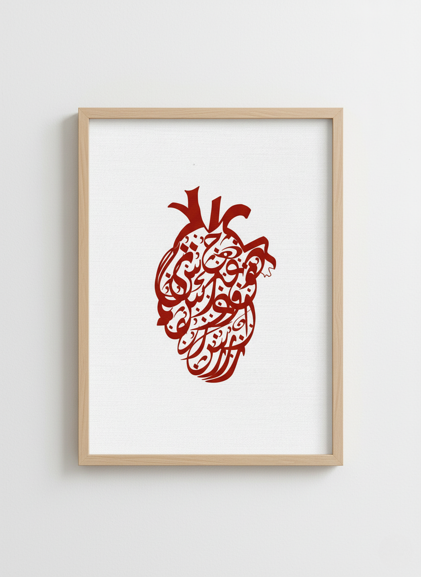 Premium Kaligrafi Kalp Çerçeveli Tablo: Aşkın ve Gönlün Sanatla İfadesi. Evinizin ruhuna dokunan eşsiz bir sanat eseri. Bu çarpıcı çerçeveli tablo anatomik bir kalp formunun içine özenle işlenmiş Arap/Osmanlı kaligrafisi ile modern iç mekan trendlerini birleştiriyor. Kırmızı rengin güçlü enerjisi ve el yazmasının manevi derinliği duvarlarınıza sadece bir dekor değil anlam yüklü bir odak noktası katıyor.