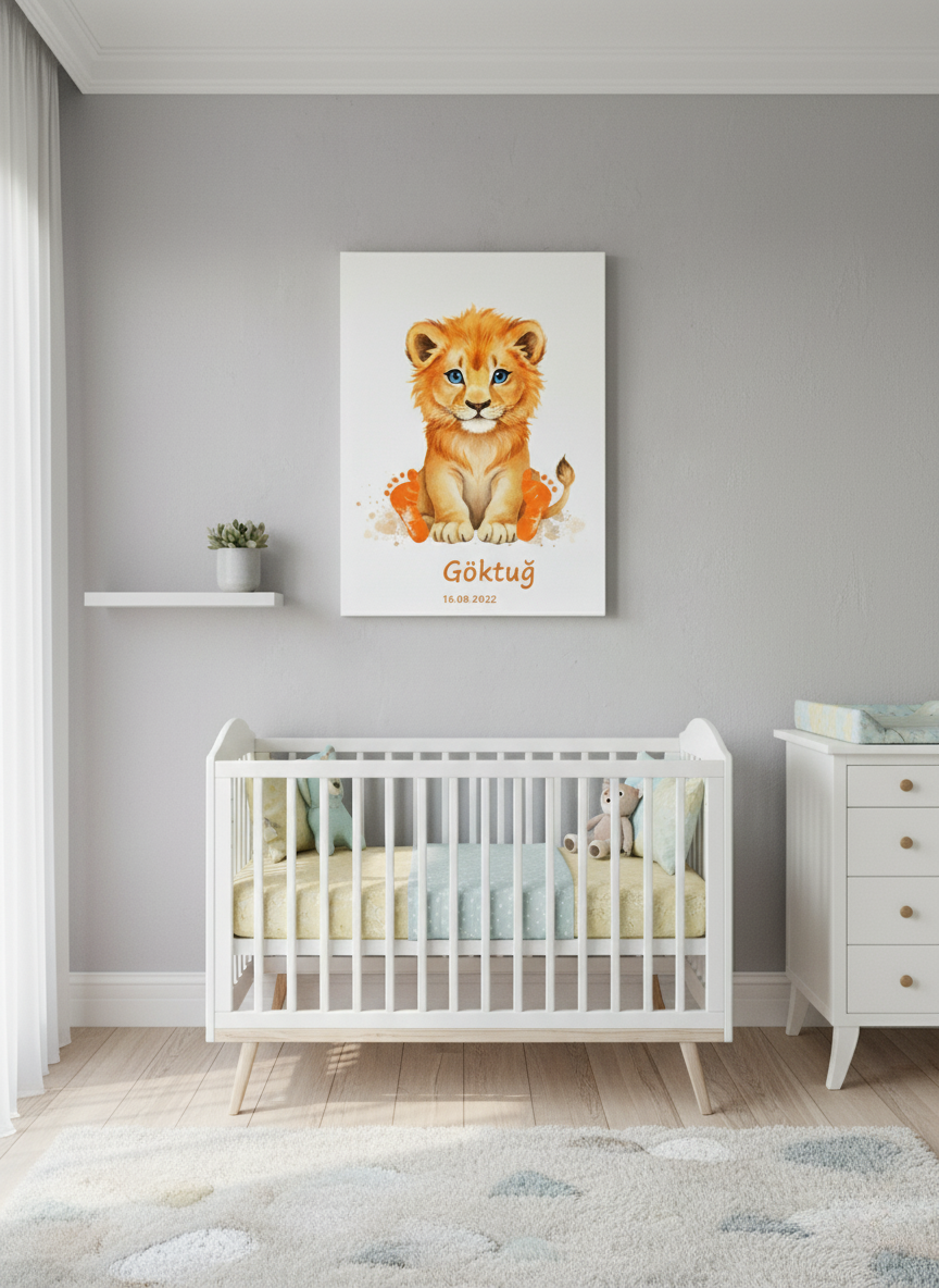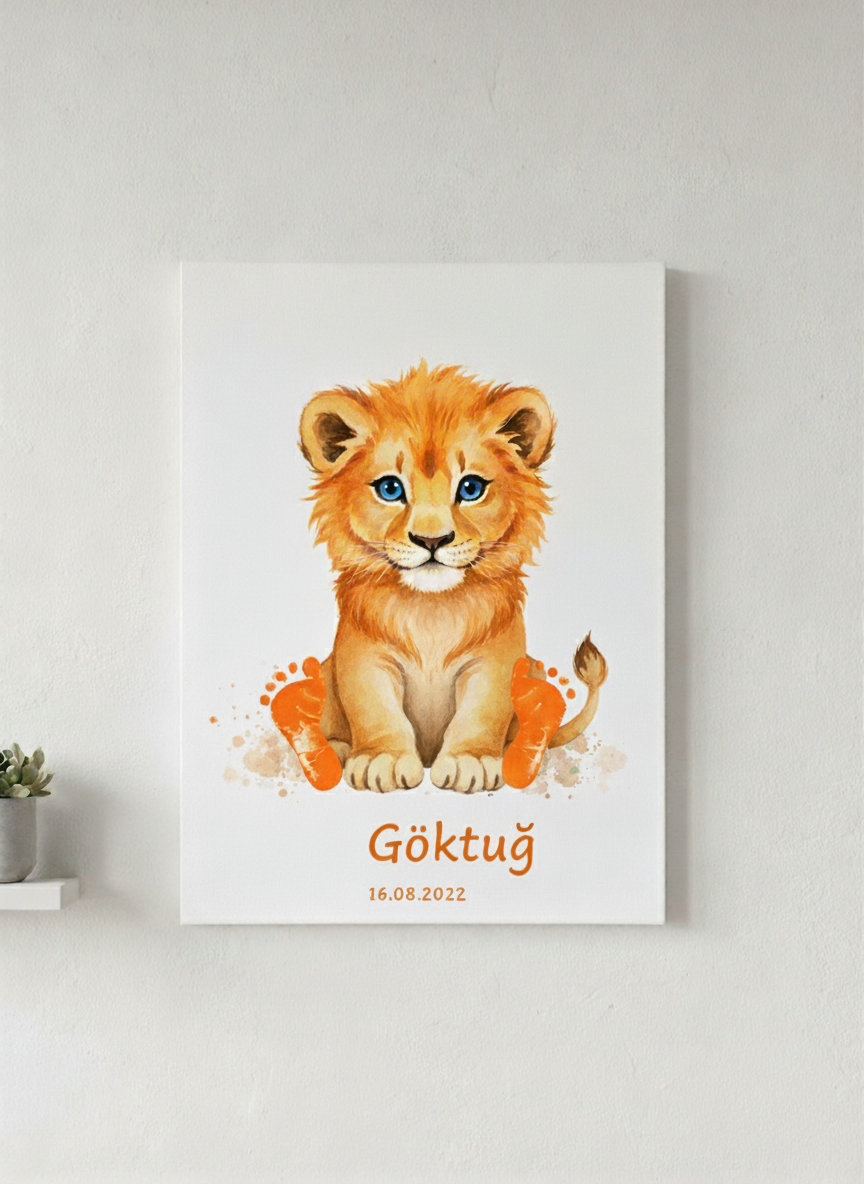 Kişiye Özel Bebek Ayak İzi Tablo Kiti – İsim ve Doğum Tarihli Hatıra Aslan Tasarımı – Boya Dahil Anı Tablosu