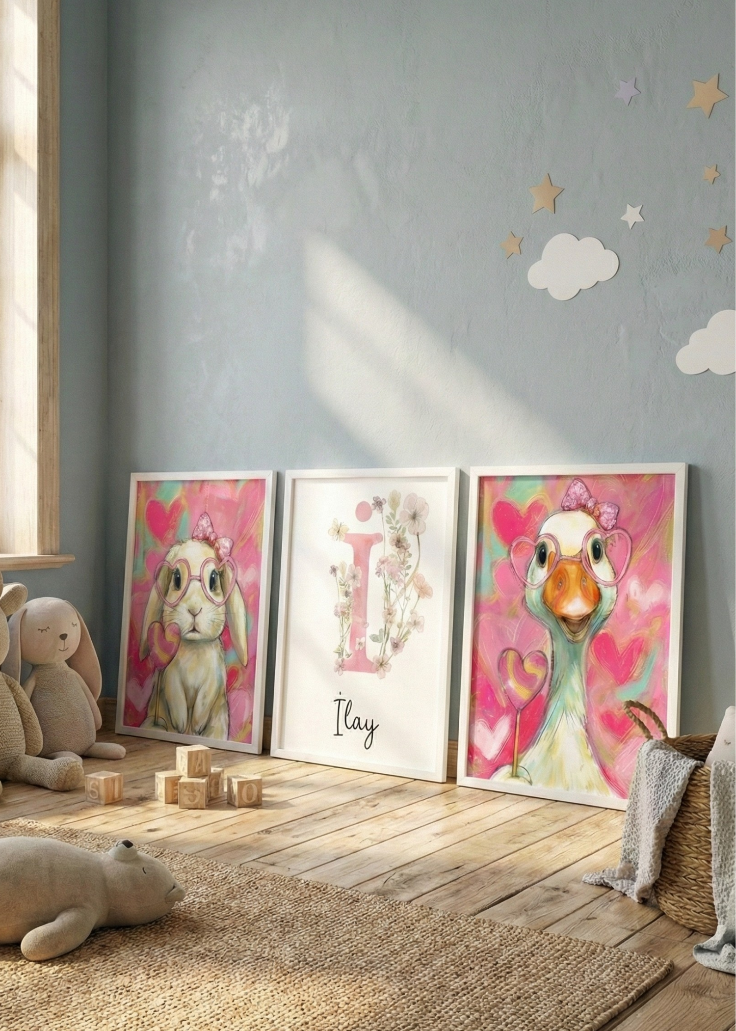 Kişiye Özel İsimli 3'lü Çocuk Odası Tablo Seti - Pembe Tavşan ve Kaz Tasarım