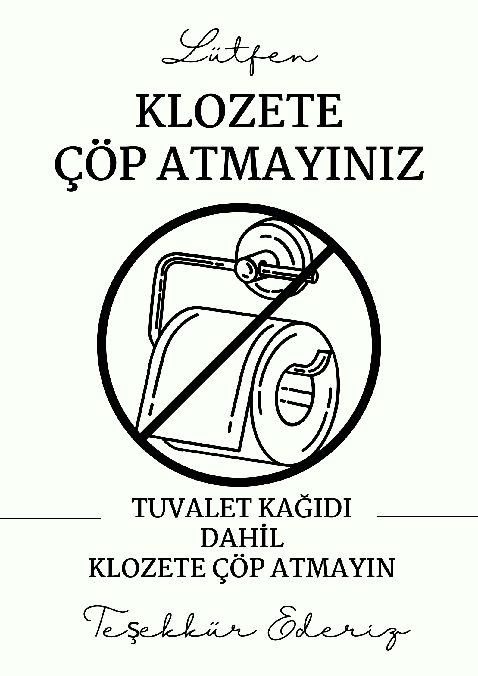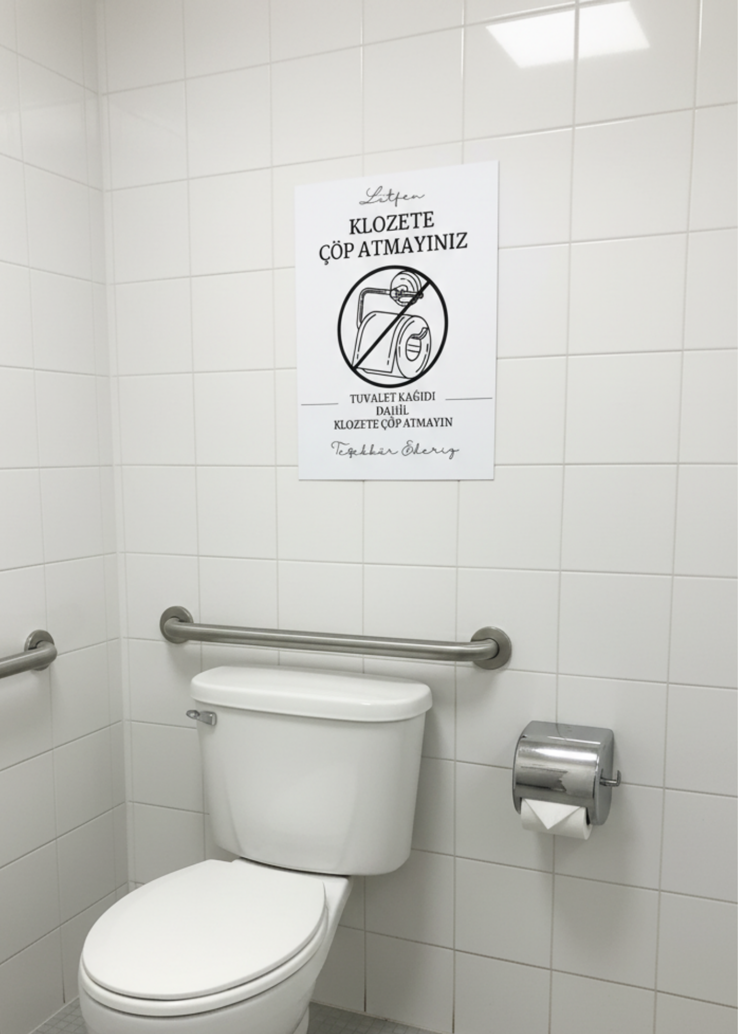 Klozete çöp atmayınız uyarı levhası tuvalet hijyenini ve tesisat düzenini korumak için kullanılan kendinden yapışkanlı etikettir, 25x35 cm ölçülerindedir, tuvalet kağıdı dahil tüm atıkların klozete atılmaması gerektiğini sade ve şık tasarımıyla net bir şekilde belirtir, suya neme buhara ve silmeye karşı dayanıklı kaliteli Dekota malzemeden üretilmiştir, duvar fayans kapı ve tüm düz yüzeylere delme gerektirmeden kolayca uygulanır, iş yeri restoran kafe otel okul ofis klinik ve ortak kullanım alanlarında düzeni ve hijyen bilincini artırmak için ideal bir uyarı levhasıdır.