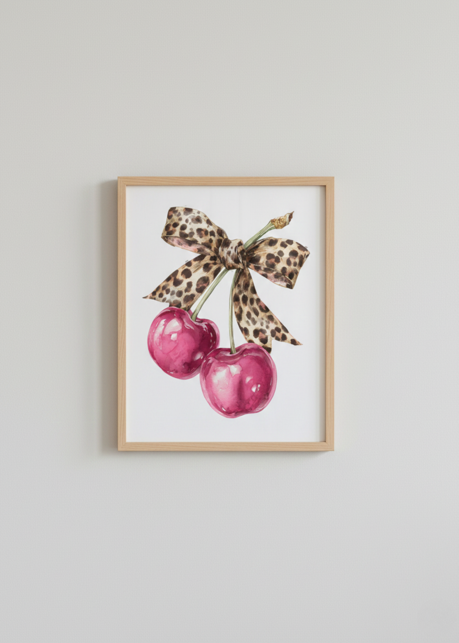 Duvarlarınıza hem tatlı bir dokunuş hem de vahşi bir şıklık katmaya ne dersiniz? Dekor Paleti'nin özel koleksiyonunda yer alan bu tasarım; Kirazın taze enerjisini, ikonik leopar desenli bir fiyonk ile buluşturuyor. Modern çizim sanatının en zarif örneklerinden biri olan bu parça, mekanınızın atmosferini anında değiştirecek.