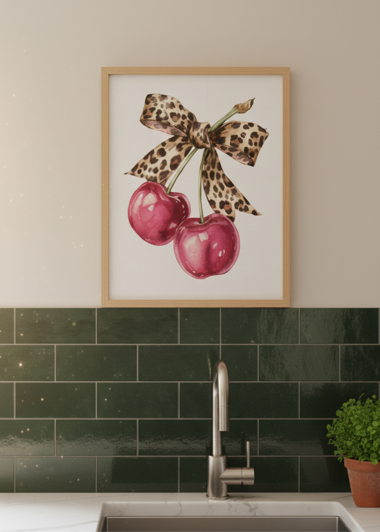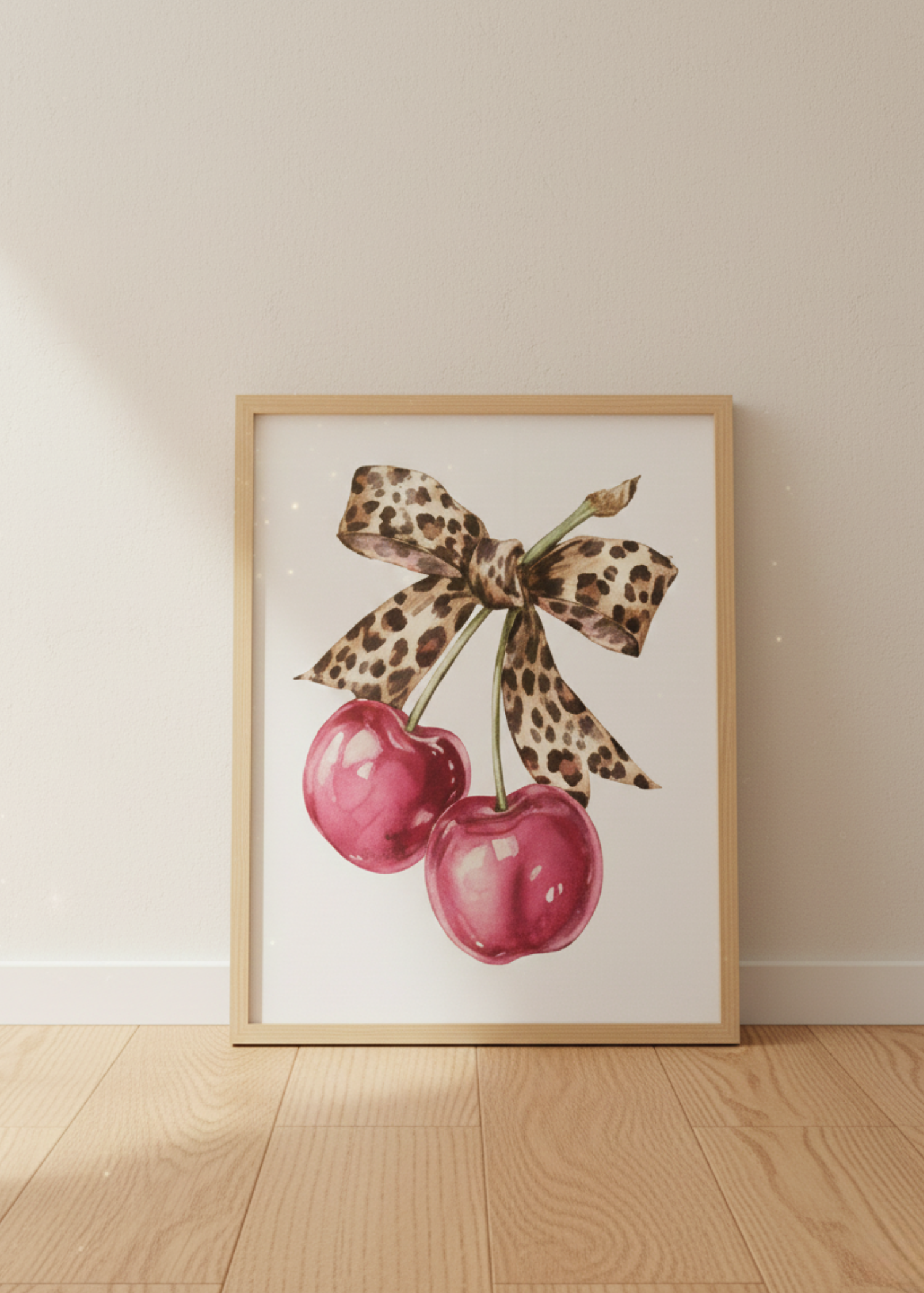 Çarpıcı Detaylar: Sulu boya efektli kiraz görüntüsü ile leopar desenli fiyonk arasındaki estetik kontrast, doğal ahşap çerçeve ile mükemmel bir denge yakaları.