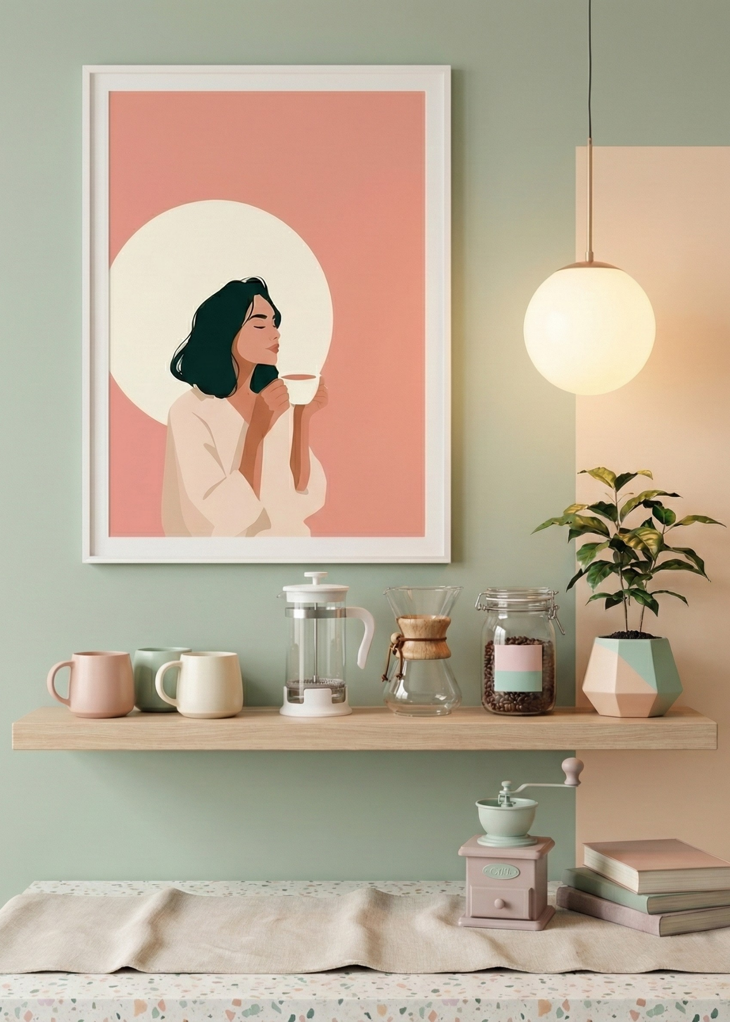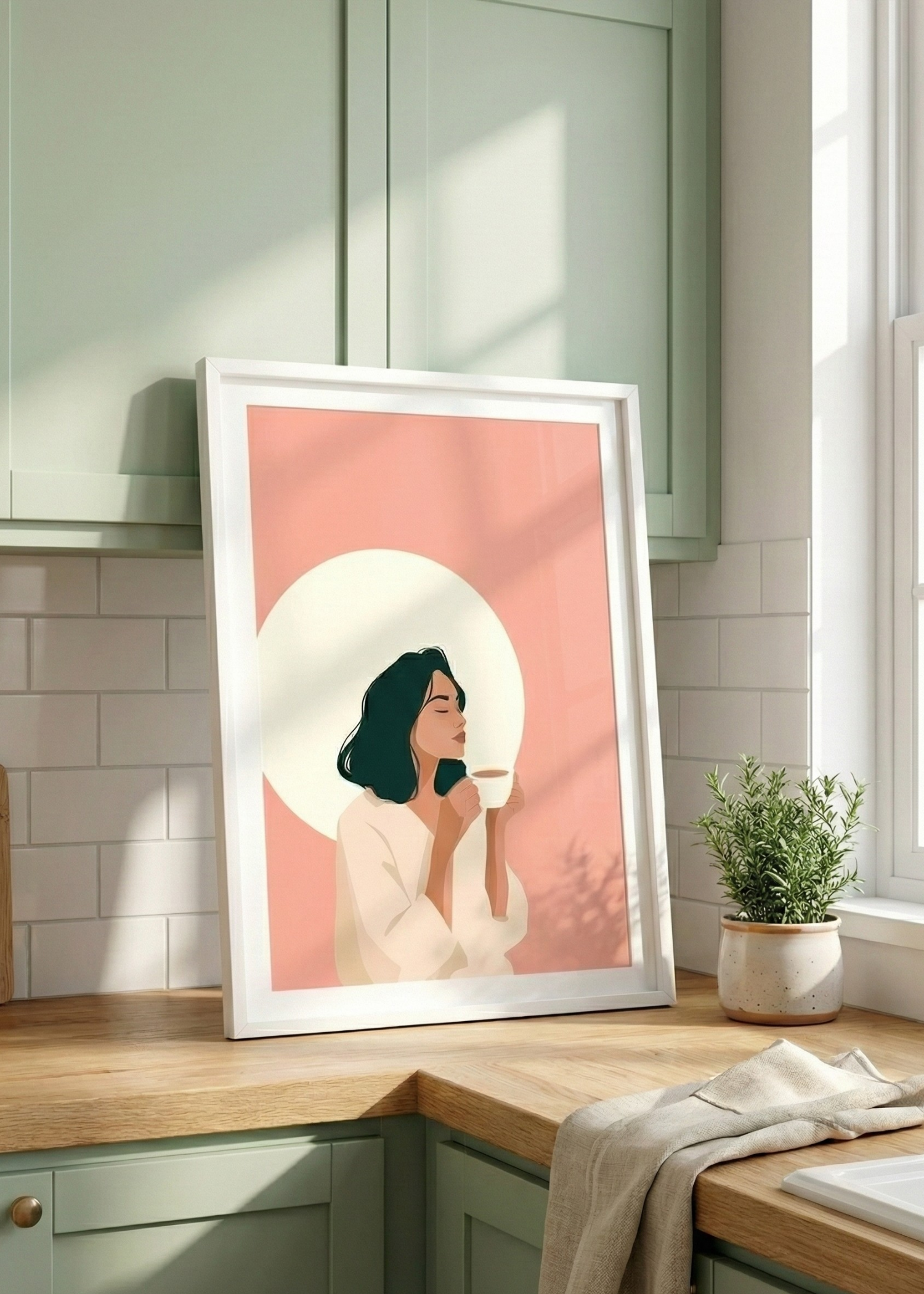 Duvarlarınızda huzurlu bir sabah enerjisi ve modern bir zarafet yaratmaya ne dersiniz? Dekor Paleti'nin yeni nesil illüstrasyon koleksiyonunda yer alan bu "Modern Kahve Keyfi" tasarımı, sadeliğin gücünü soft pastel tonlarla birleştiriyor. Beyaz çerçevesiyle modern mutfaklar, kahve köşeleri ve ferah yaşam alanları için mükemmel bir tamamlayıcıdır.