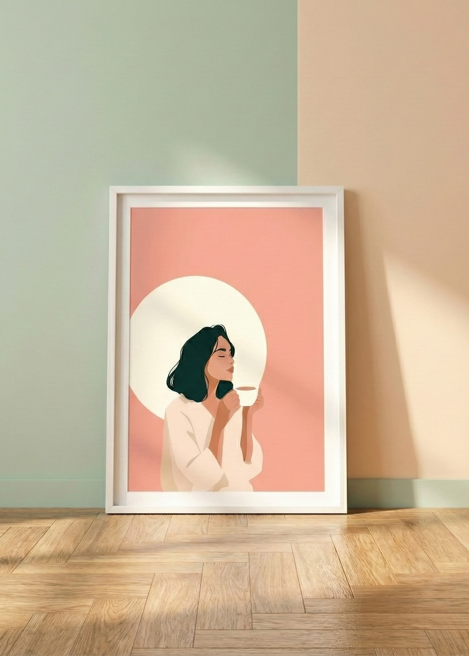 Minimalist İllüstrasyon: Modern flat art (düz sanat) tarzıyla hazırlanan bu tasarım, günün en huzurlu anını—kahve keyfini—estetik bir dille duvarlarınıza taşır.