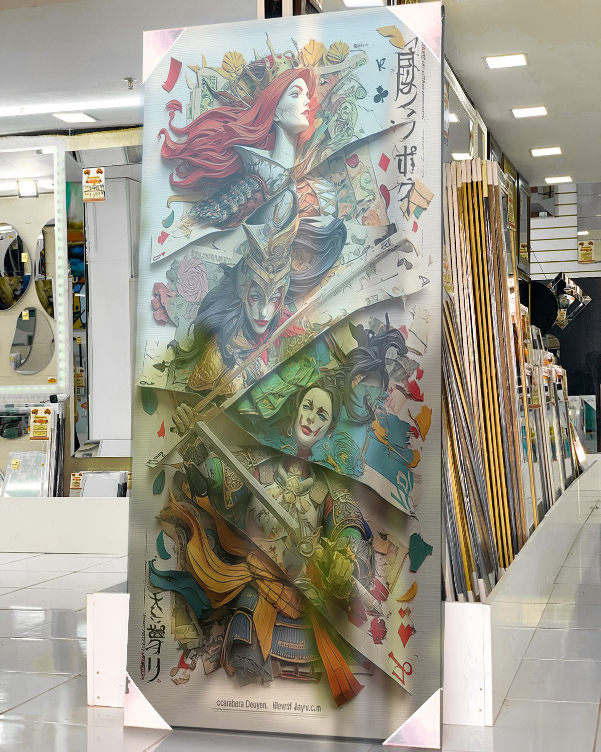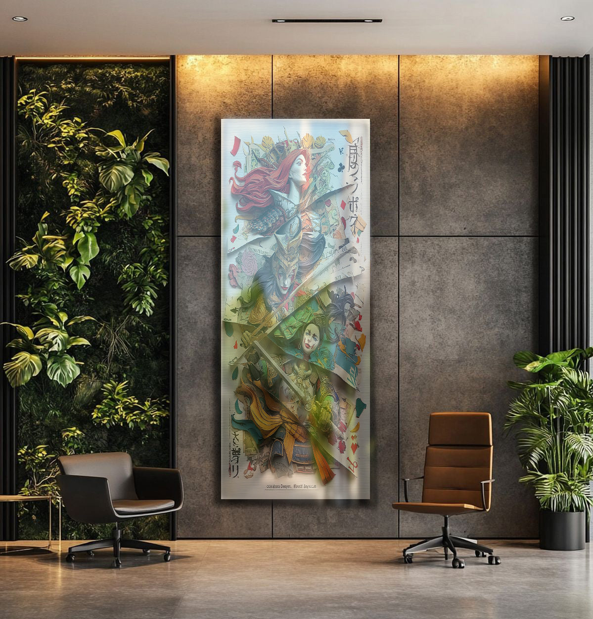 Oyun kartlarının estetiğini ve popüler kültür ikonlarını birleştiren bu özel tablo, Kraliçe (Queen) figürü ile Joker karakterini samuray temasıyla yeniden yorumluyor. Canlı renkler, ince detaylar ve güçlü çizgilerle hazırlanan tasarım, modern dekorasyona hem sanatsal hem de sıra dışı bir dokunuş katıyor.