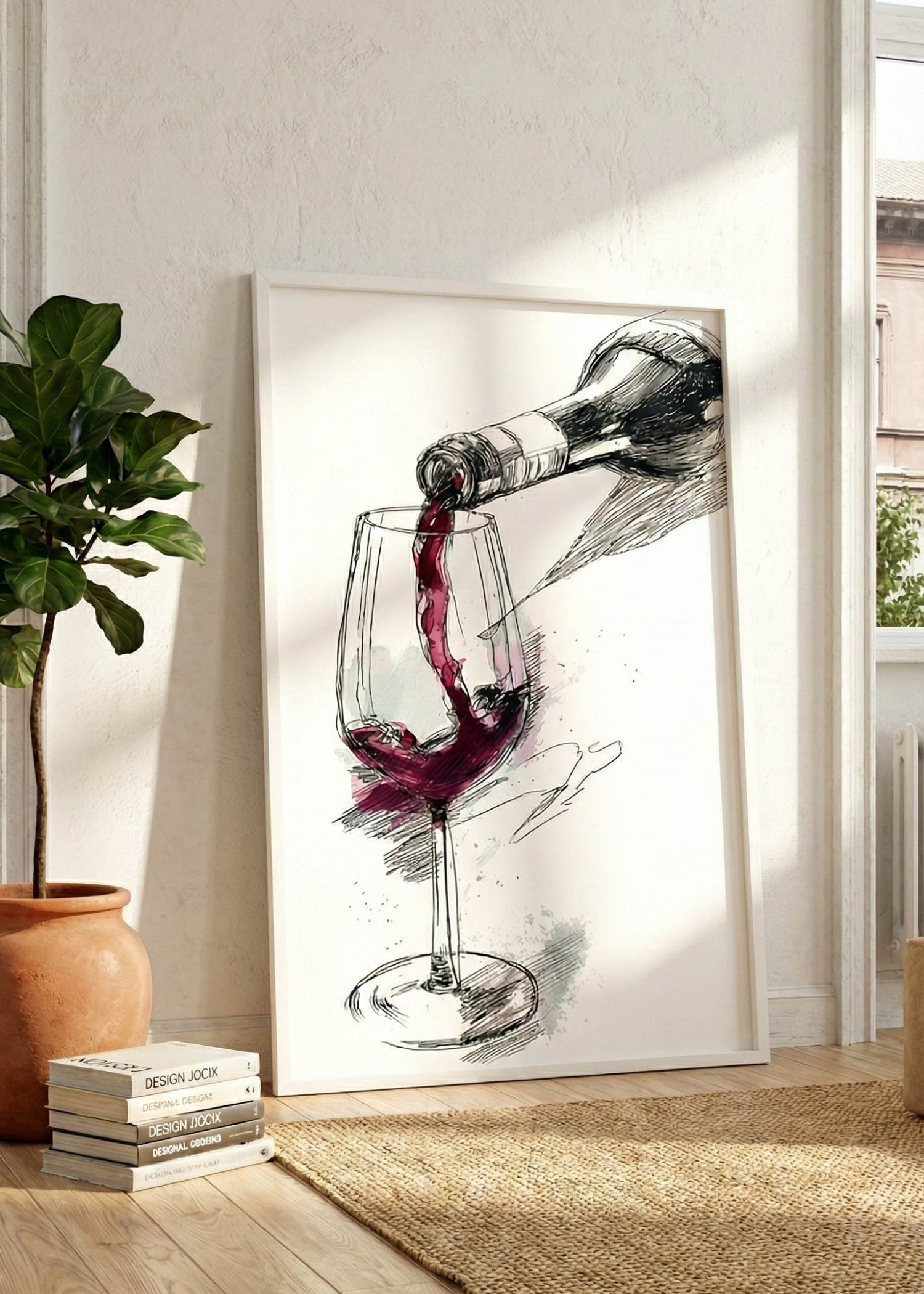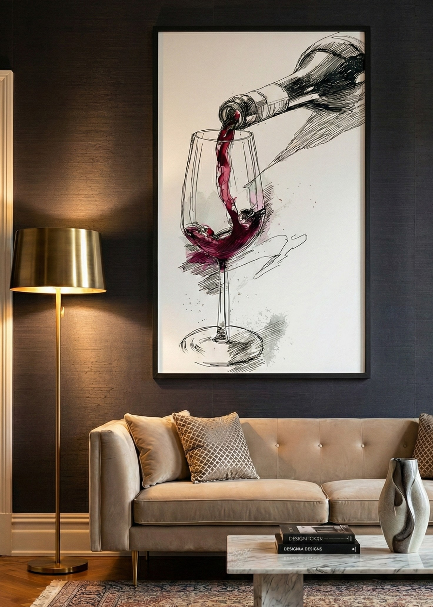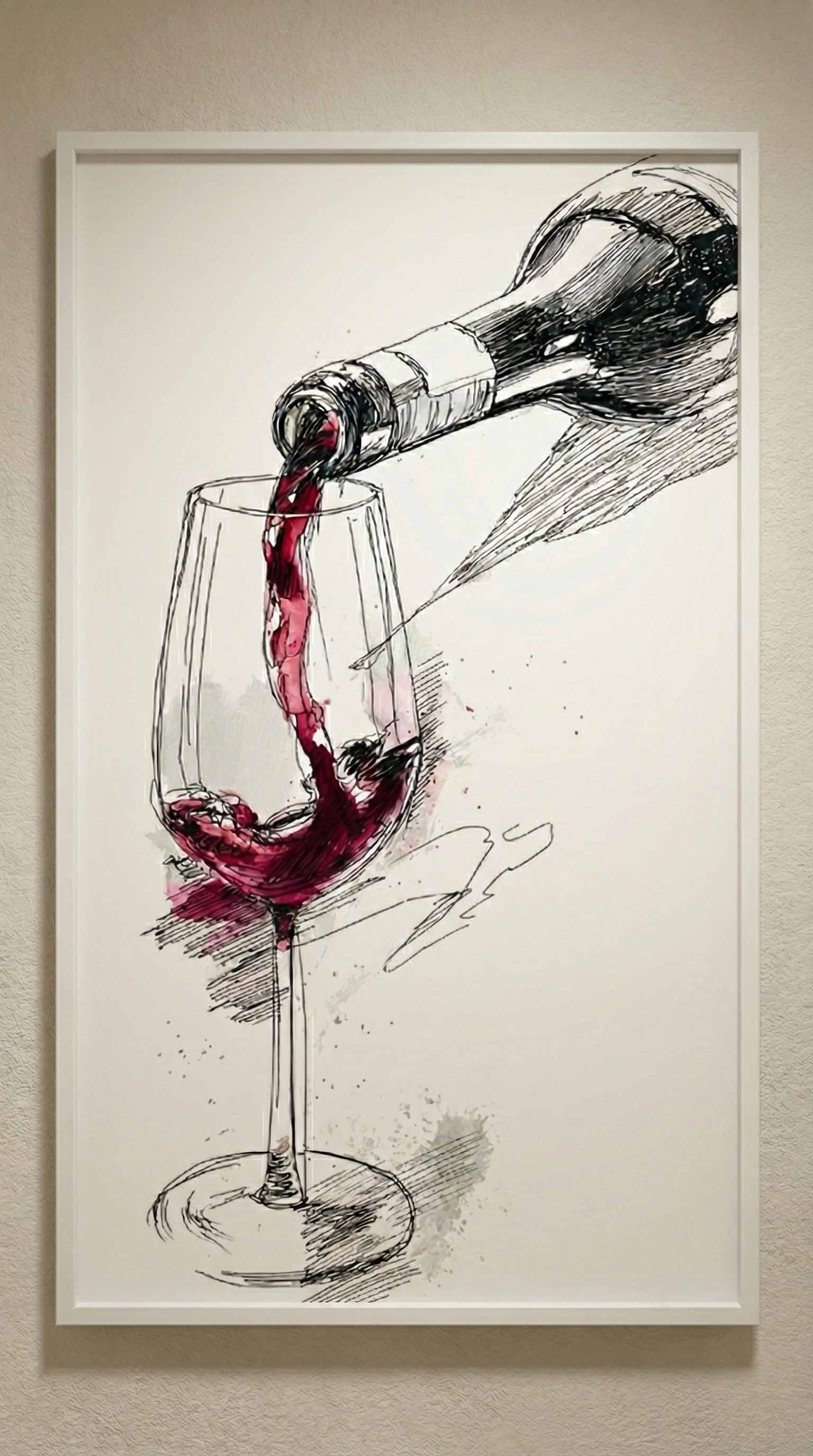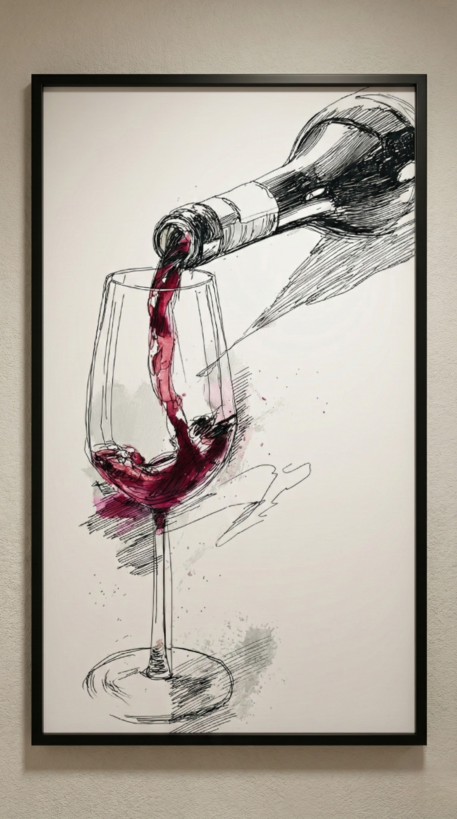 Şarap şişesi ve kadeh detaylarından oluşan çizim stil tasarımı ile hazırlanan bu çerçeveli tablo, modern ve sade dekorasyon tarzına uyum sağlar. Minimal çizgileri ve dengeli renk kullanımı sayesinde mutfak, salon, yemek alanı, kafe ve restoran dekorasyonlarında tercih edilebilir.