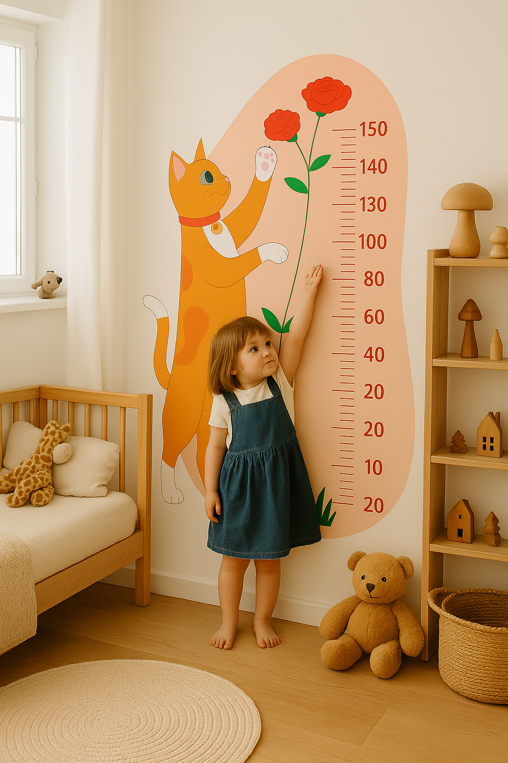 Miniklerin büyümesini her gün keyifle takip edin! Pastel tonlarda sevimli kedi illüstrasyonuna sahip bu boy ölçer duvar sticker’ı, çocuk odasına hem sıcak bir dekor hem de pratik bir yükseklik cetveli kazandırır. Pürüzsüz yüzeylere kolayca yapışır, gerektiğinde dikkatlice söküldüğünde duvara zarar vermez.