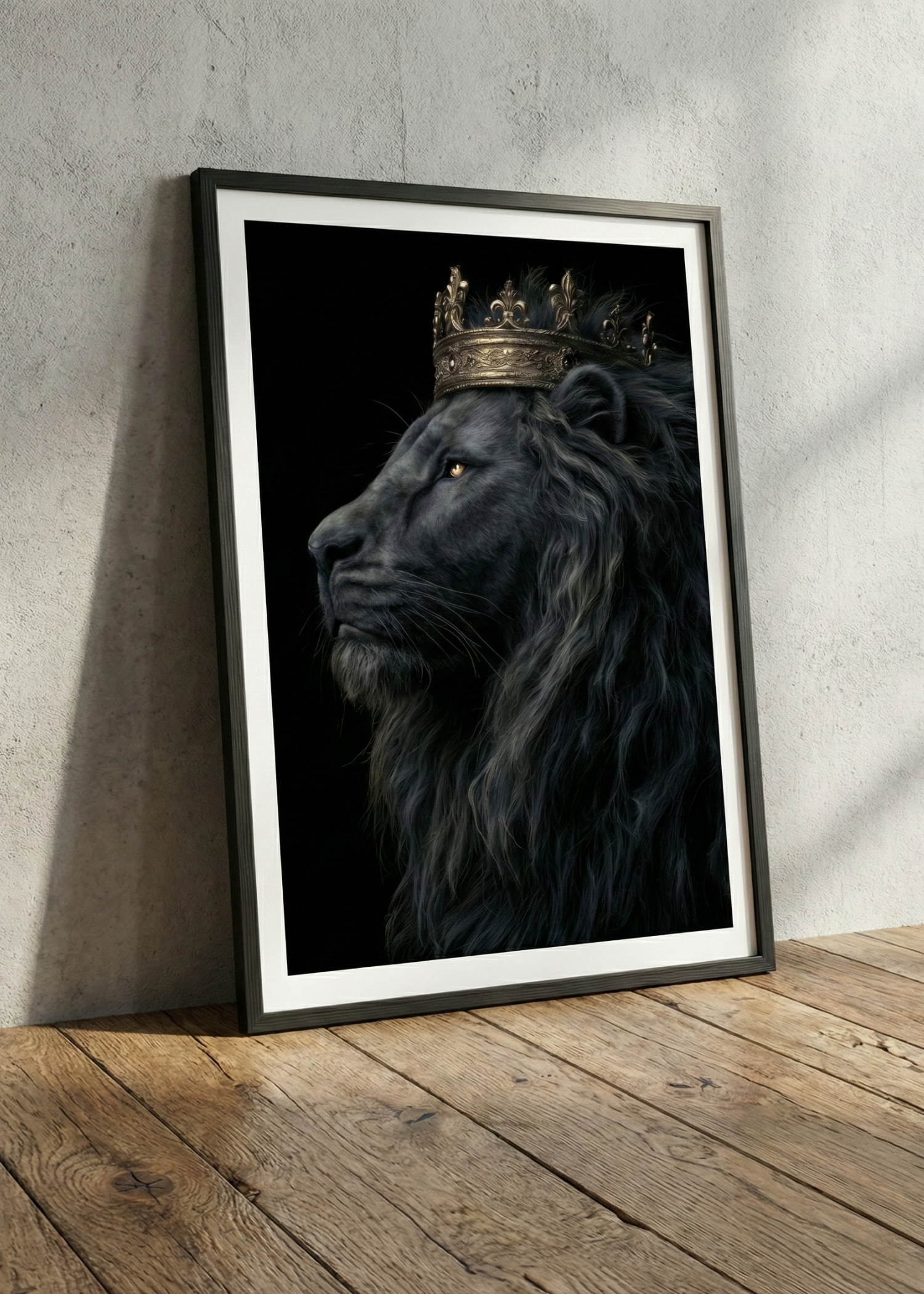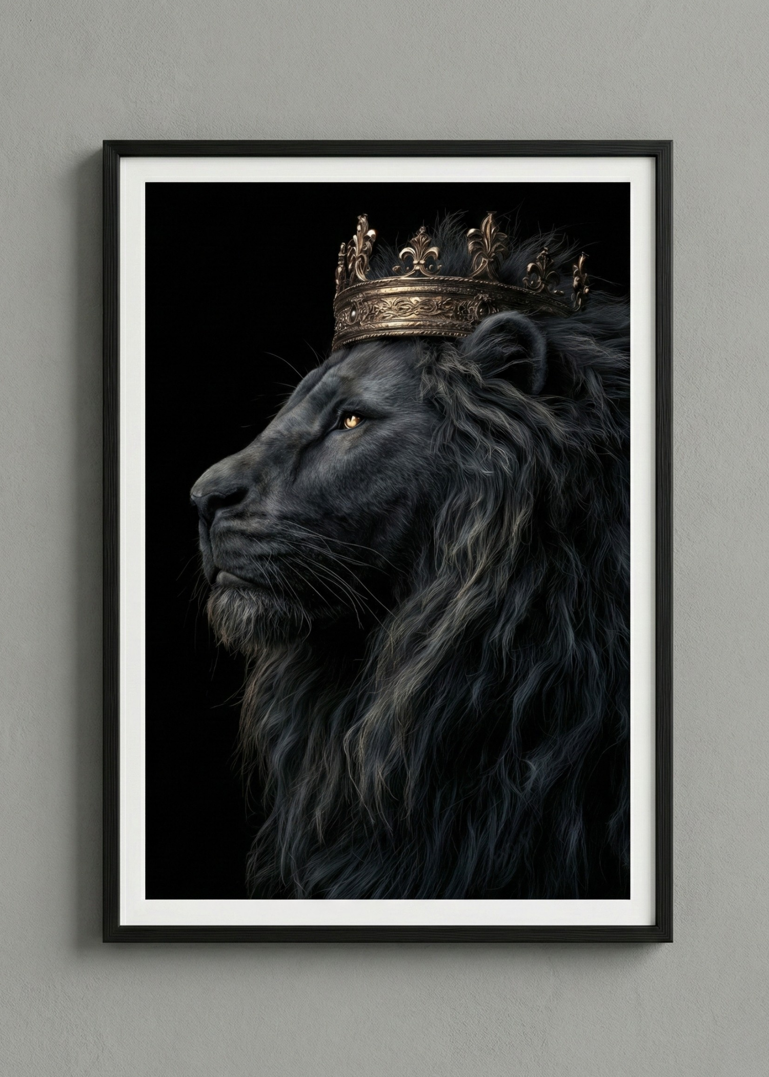GÜCÜN VE ASALETİN ZİRVESİ: ALTIN TAÇLI SİYAH ASLAN KRAL ÇERÇEVELİ TABLO