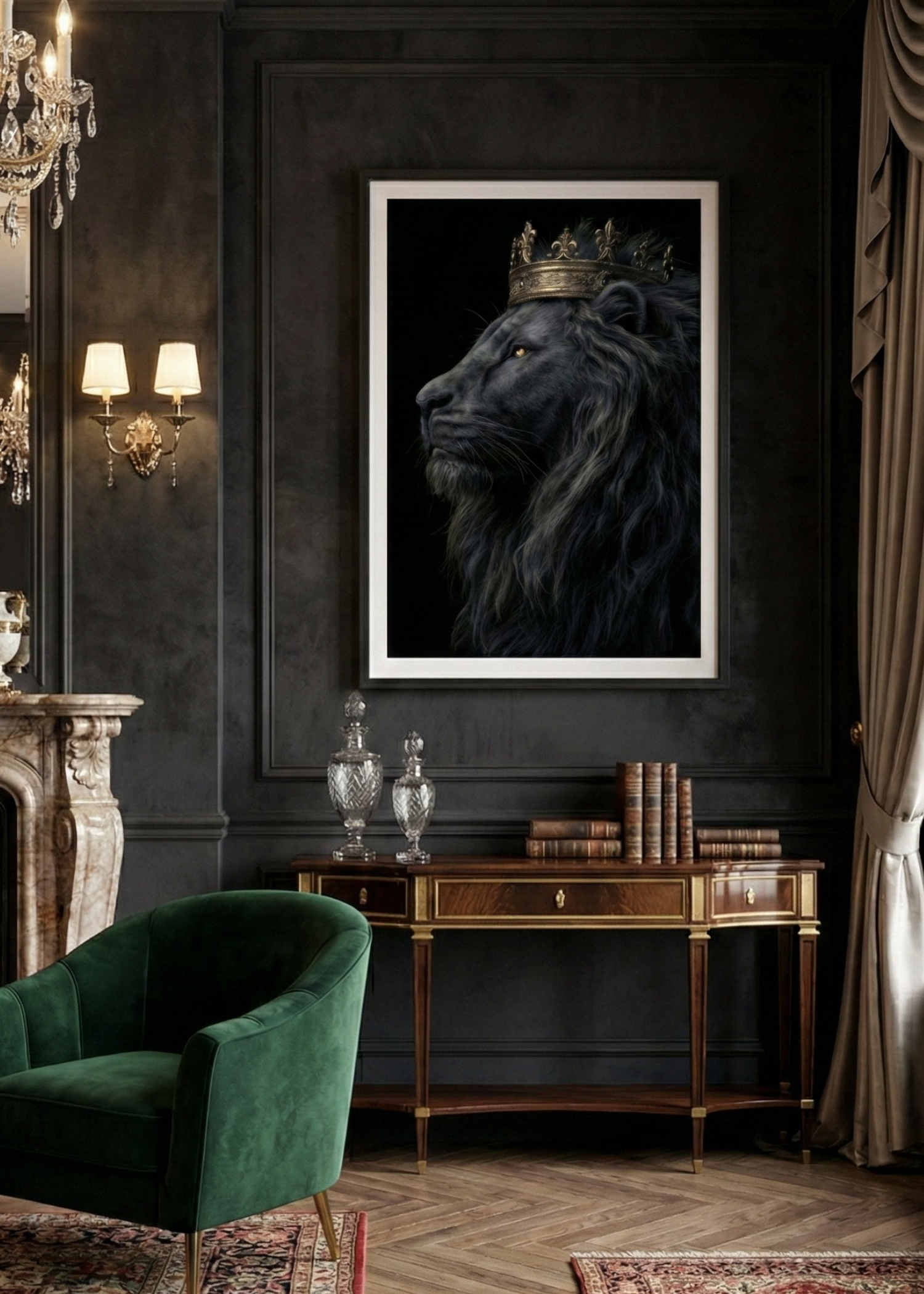 Otoriter Kontrast: Derin siyah zemin üzerindeki altın varak görünümlü taç ve aslanın vakur bakışları, mekanınıza anında prestijli bir hava katar.