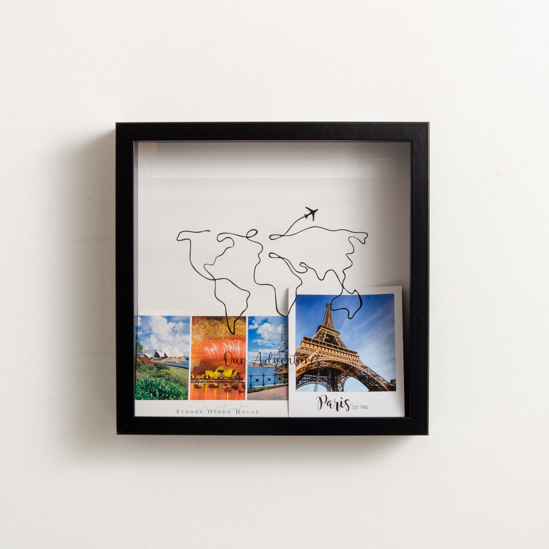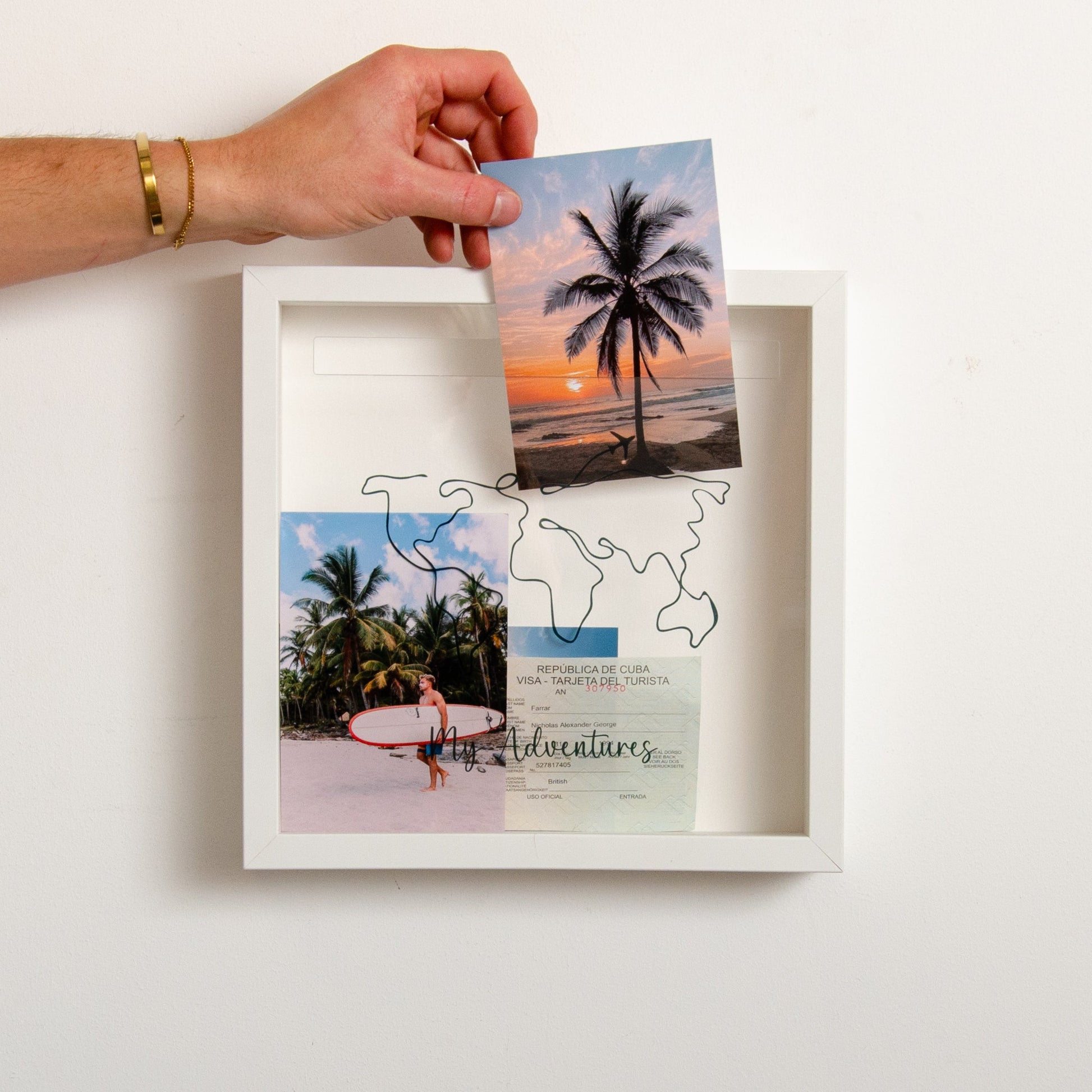 Dünya haritası bu delikli çerçeveli tablo , sadece dekoratif bir ürün değil; aynı zamanda anı kutusu işleviyle de farklı tasarımlar yaratıyor.
