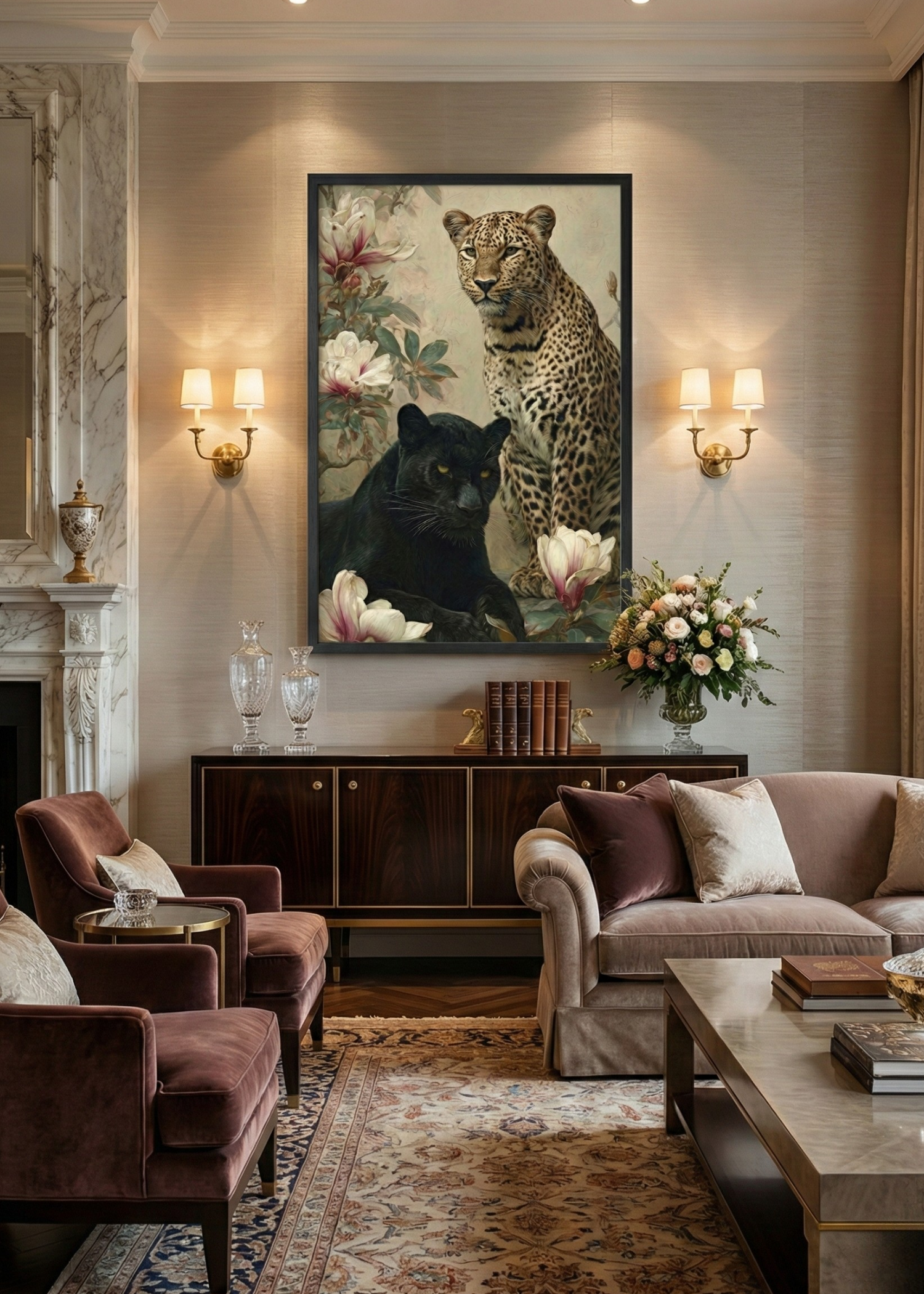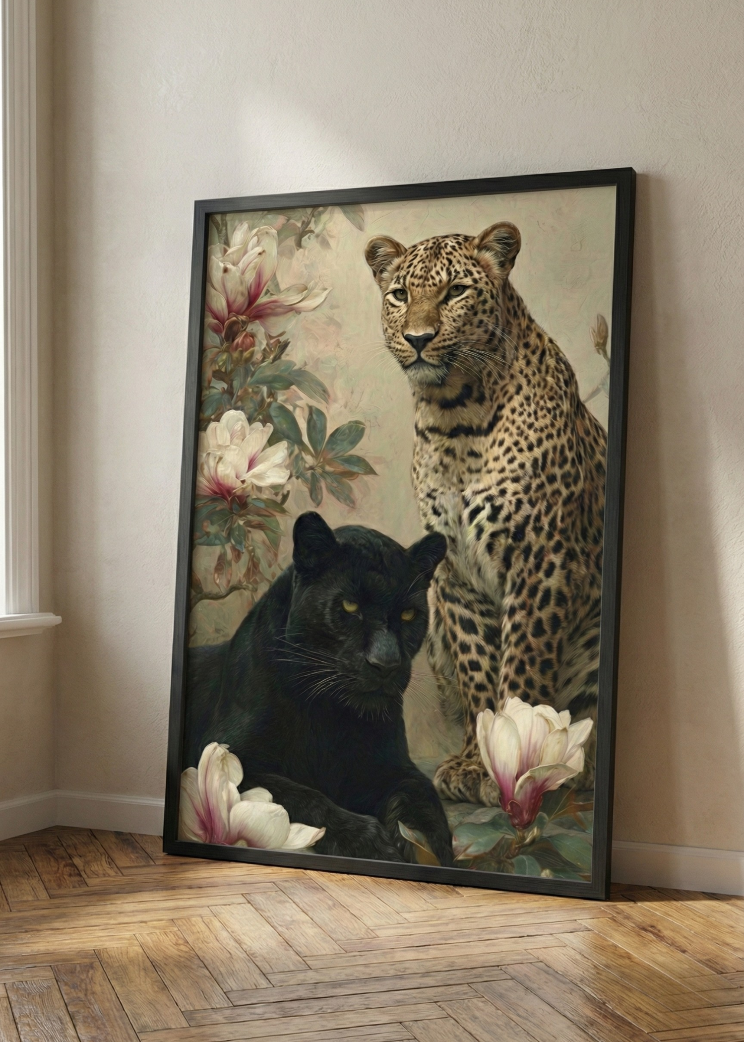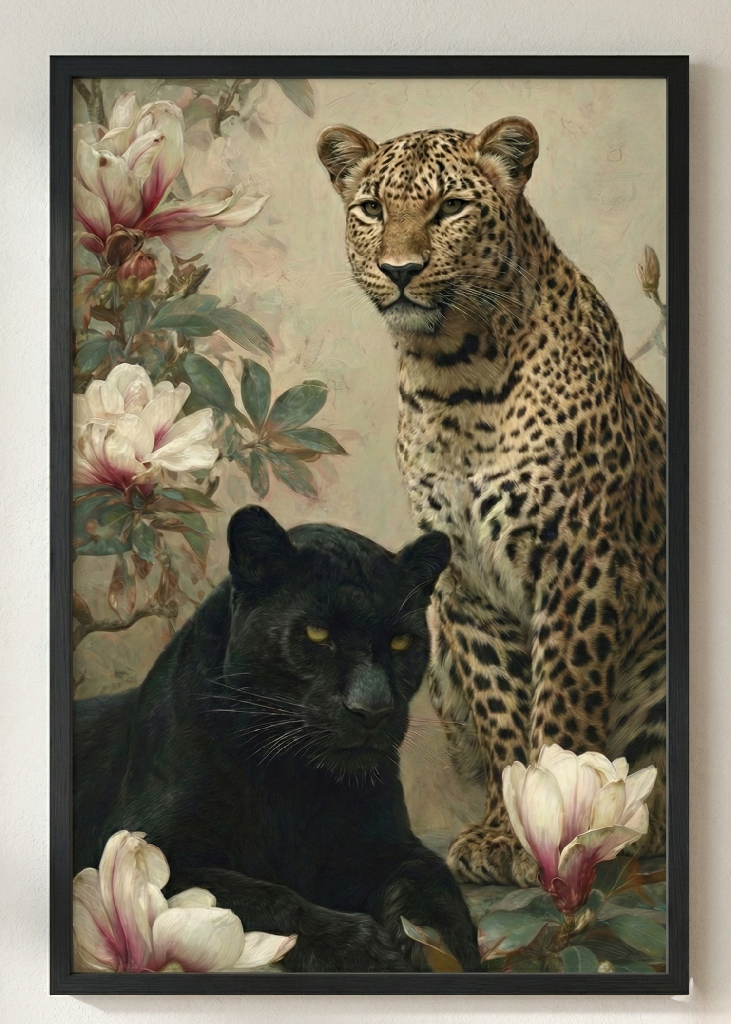 Dualite ve Kontrast: Leoparın doğal desenleri ile kara panterin gizemli koyuluğu arasındaki zıtlık, manolyaların soft tonlarıyla dengelenerek görsel bir denge sunar.