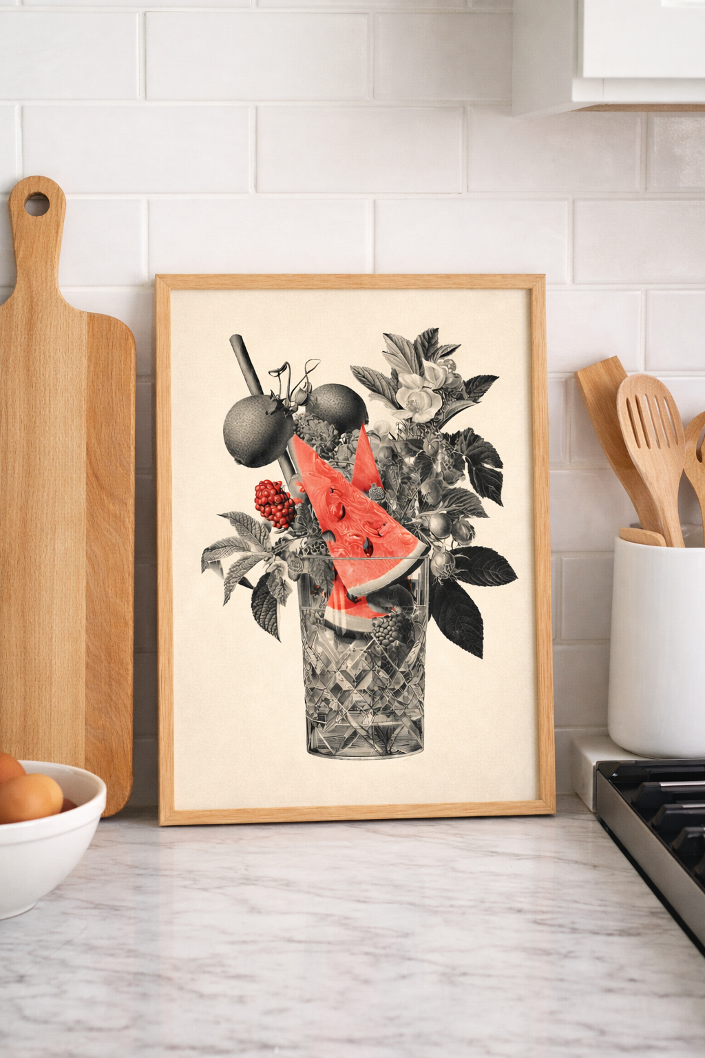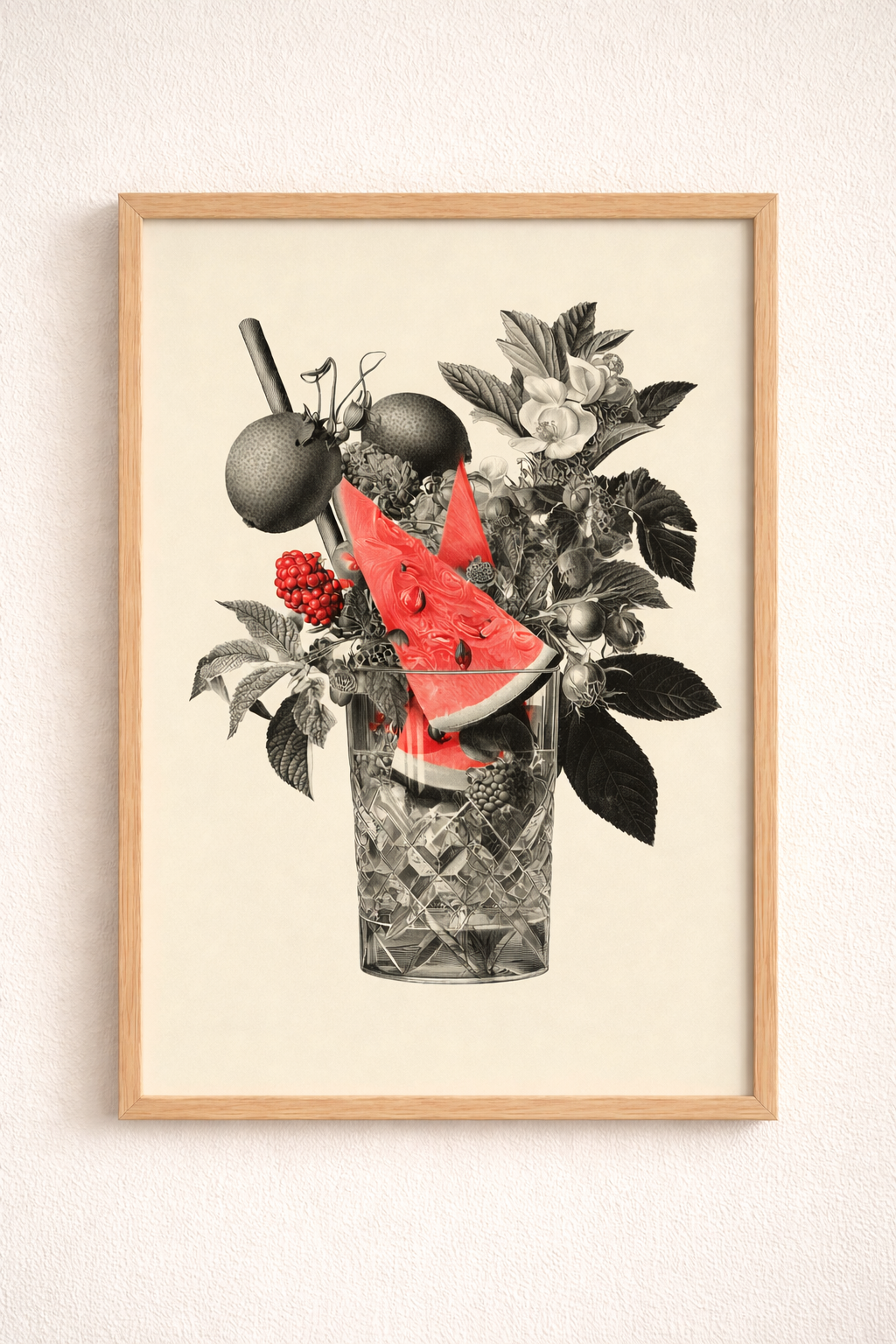 Retro-Modern Kolaj: Siyah-beyaz vintage meyve ve çiçek çizimleri üzerine parlaklıkları canlı renkli karpuz detayı, çeşitli derinlik ve sıradan bir kenarlıklık katar.