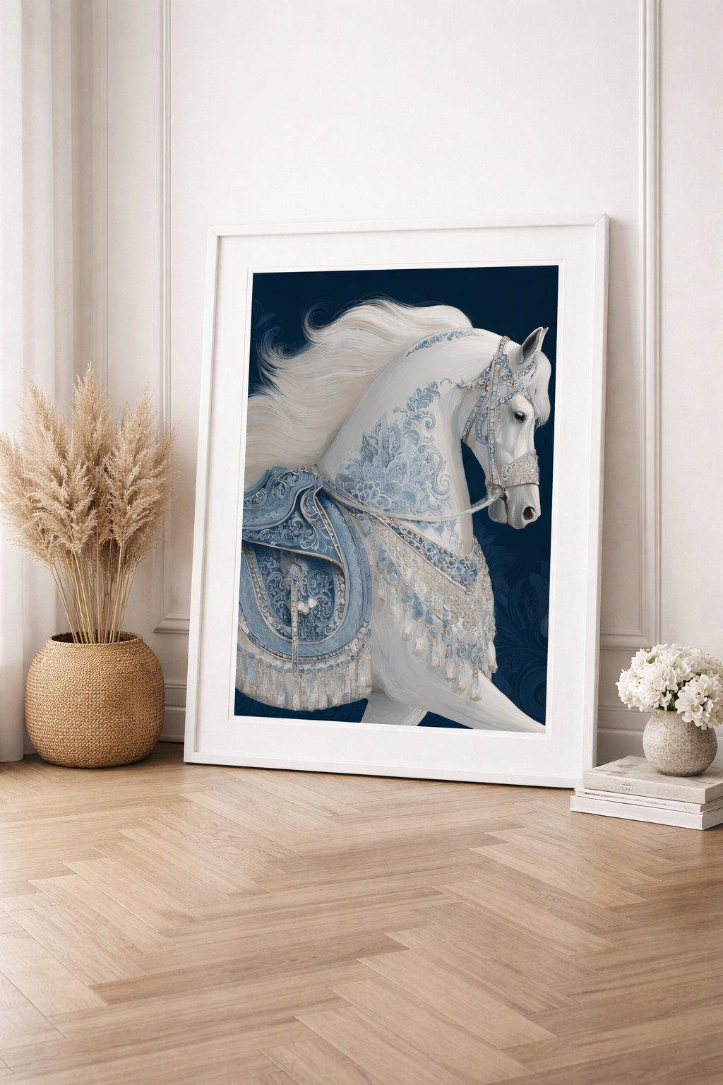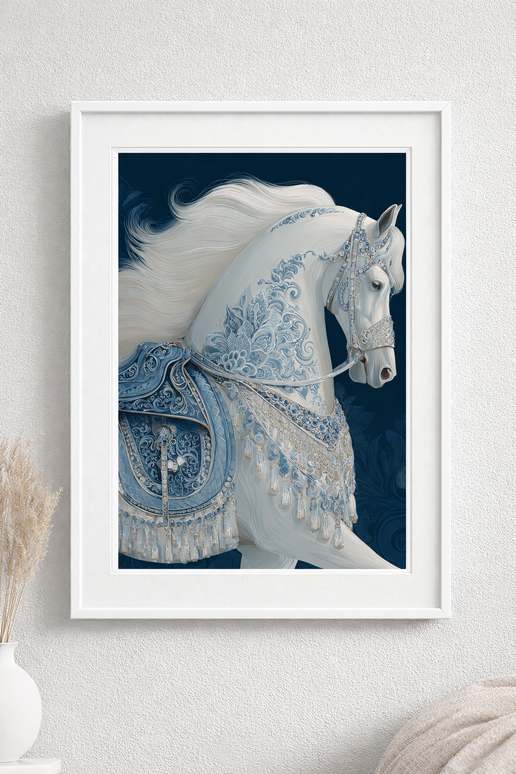 Dramatik Kontrast: Derin lacivert arka plan, beyaz atın asaletini ve üzerindeki detayları ön plana çıkararak her türlü ışık altında büyüleyici bir görünüm sunar.
