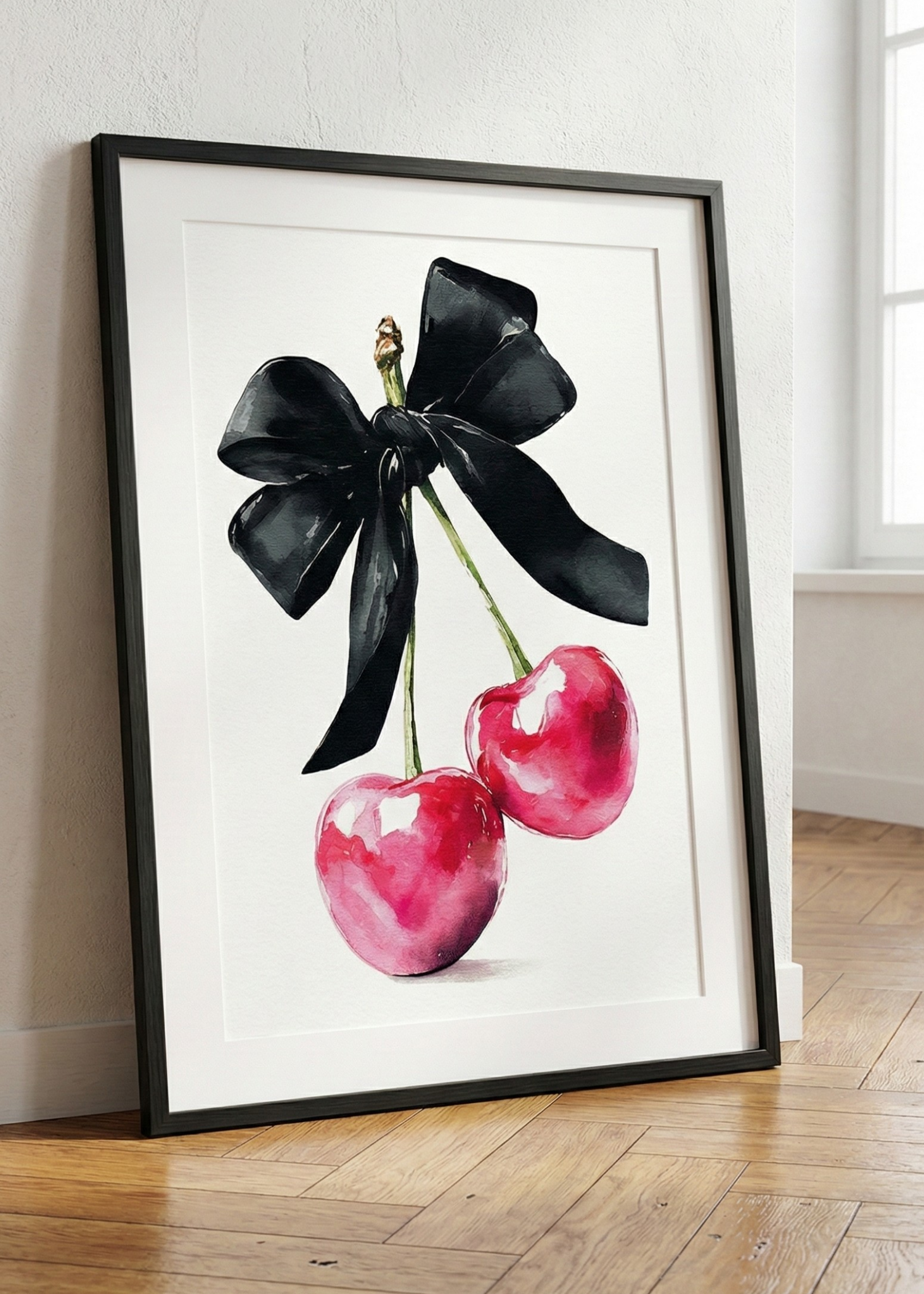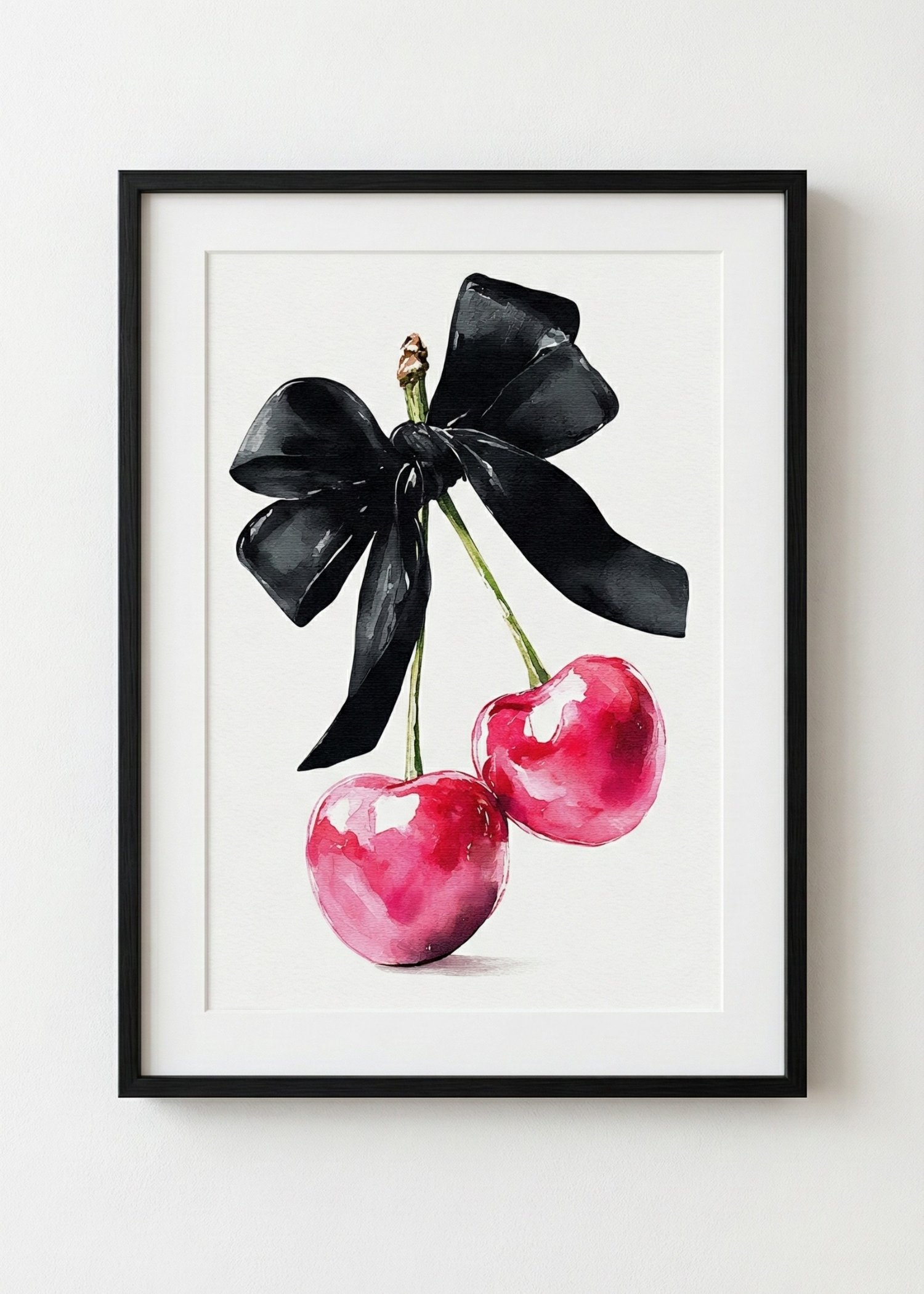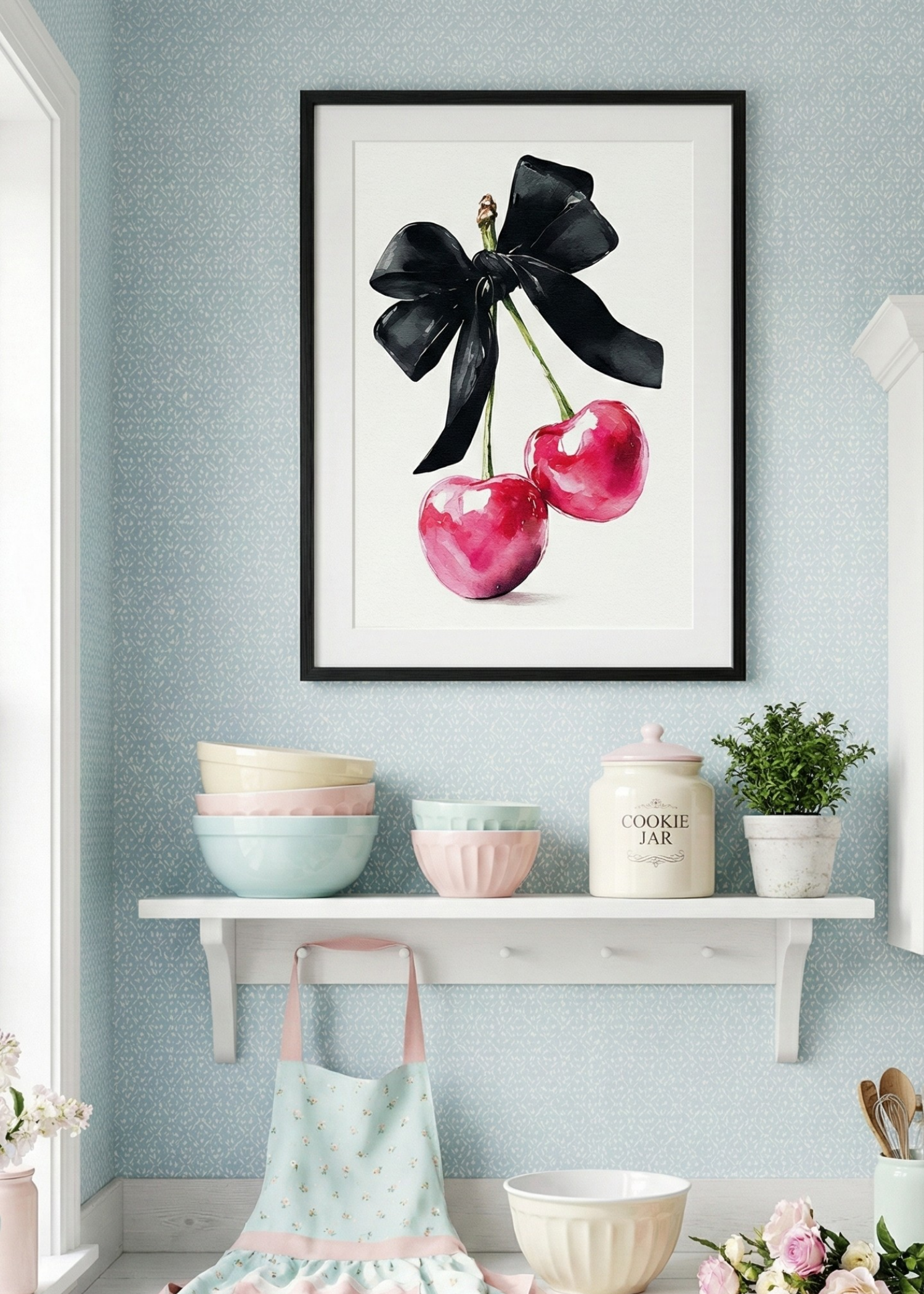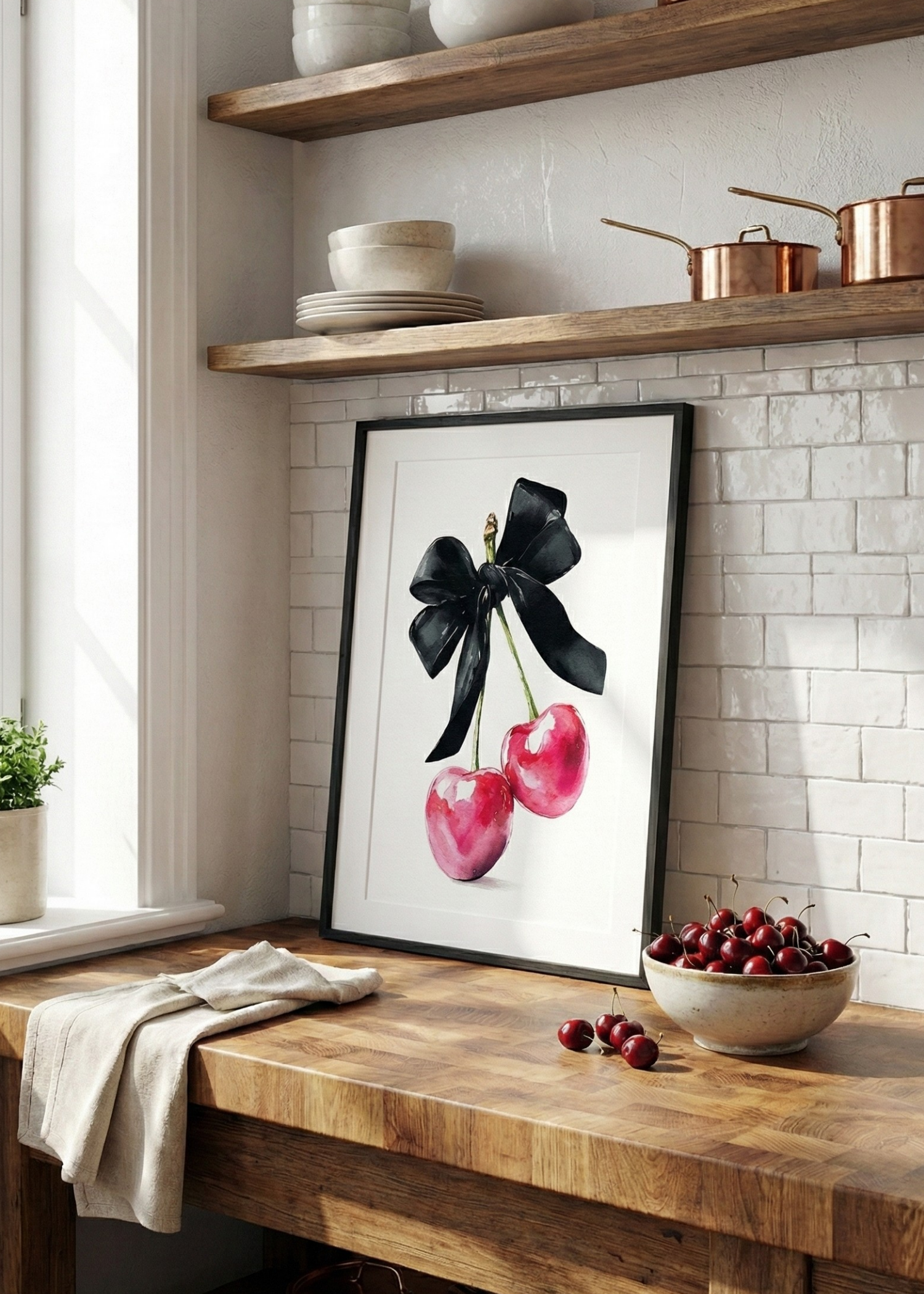 Coquette Stil Siyah Fiyonklu Kiraz Çerçeveli Tablo - Şık ve Sanatsal Mutfak Dekoru