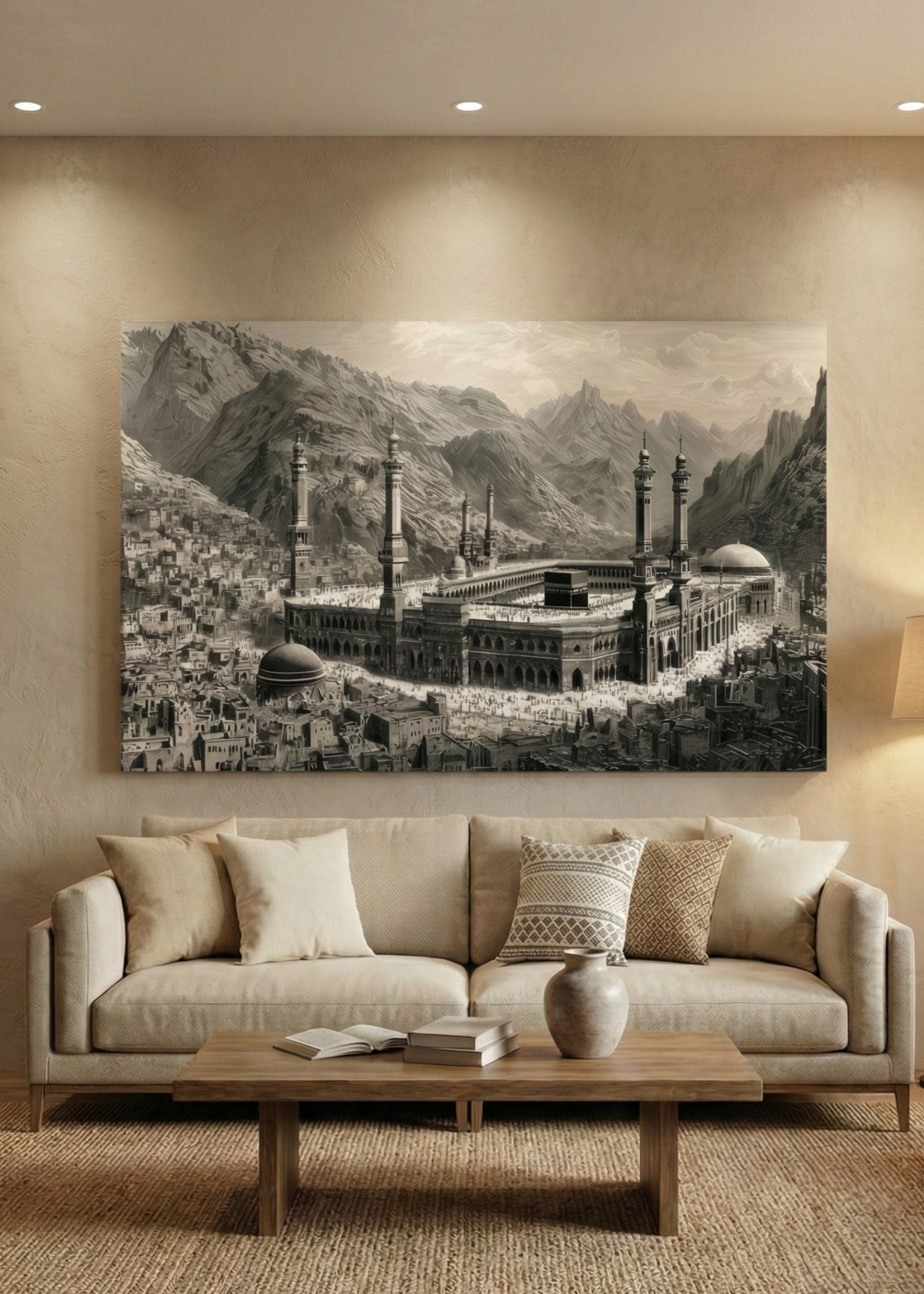 Kabe temalı bu çerçevesiz kanvas tablo siyah beyaz estetik yorumu ile yaşam alanlarına derinlik ve manevi bir atmosfer kazandırır Detaylı şehir silüeti ve kutsal mekan vurgusu ile salon oturma odası ibadet alanı veya çalışma odası için güçlü bir duvar dekorudur Yüksek çözünürlüklü baskı teknolojisi sayesinde net detaylar ve doğal tonlar sunar Kalın şase üzerine gerilmiş kaliteli kanvas yapısı ile uzun ömürlü kullanım sağlar Çerçevesiz tasarımı modern ve sade dekorasyon stilleriyle uyum sağlar Manevi değeri yüksek şık ve anlamlı bir hediye alternatifi arayanlar için ideal bir seçimdir