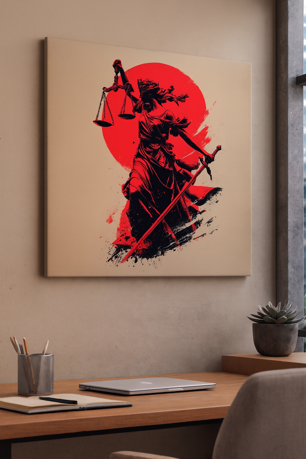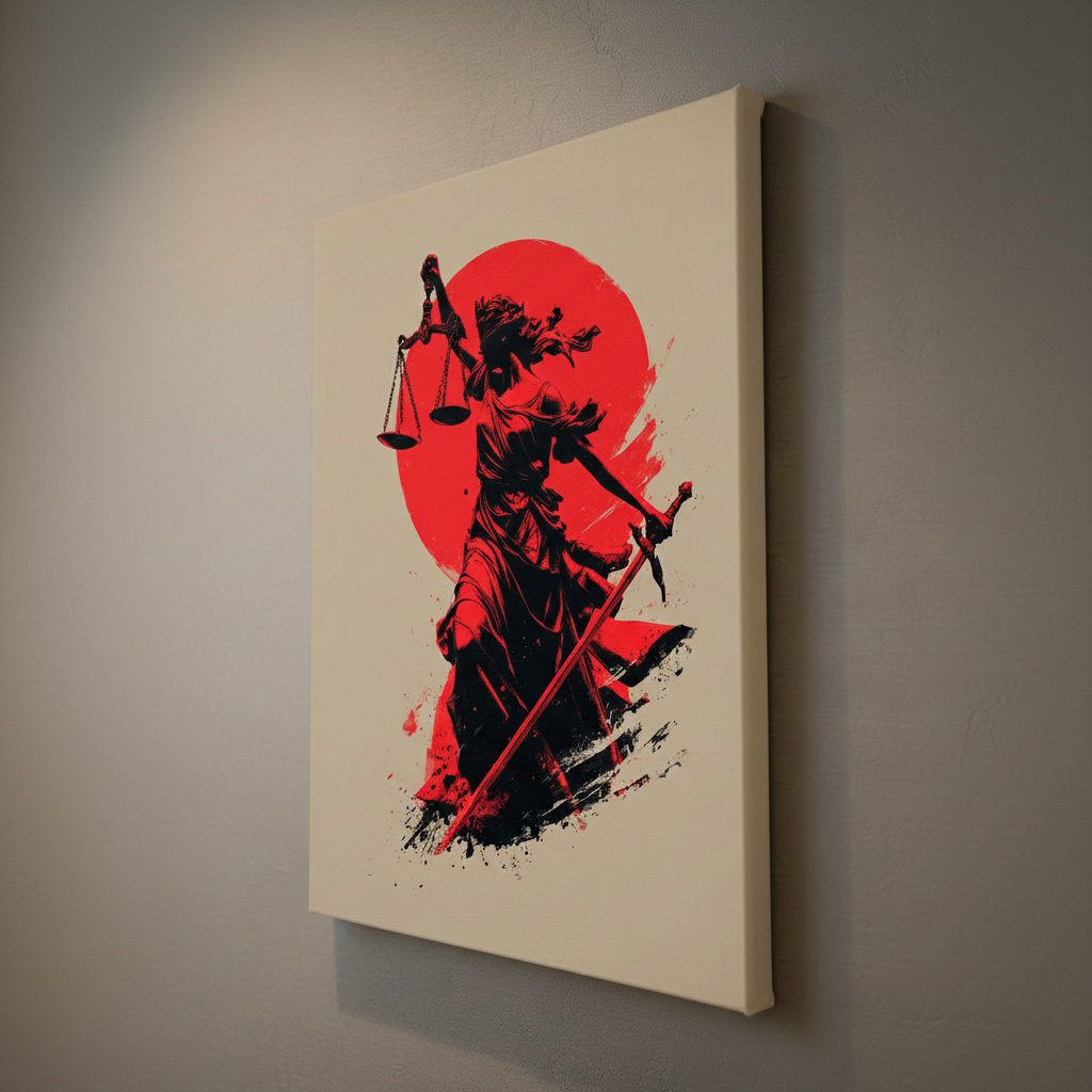 Hukukun evrensel sembollerini Uzak Doğu'nun disiplini ve estetiğiyle yeniden yorumlamaya hazır mısınız? Dekor Paleti’nin bu özel "Japonic" serisi; adalet tanrıçası Themis’i, klasik kılıç yerine bir samuray kılıcı (katana) ve ikonik kırmızı güneş motifiyle buluşturuyor. Hem modern ofis tasarımları hem de minimal dekorasyon tarzları için cesur ve prestijli bir odak noktasıdır.