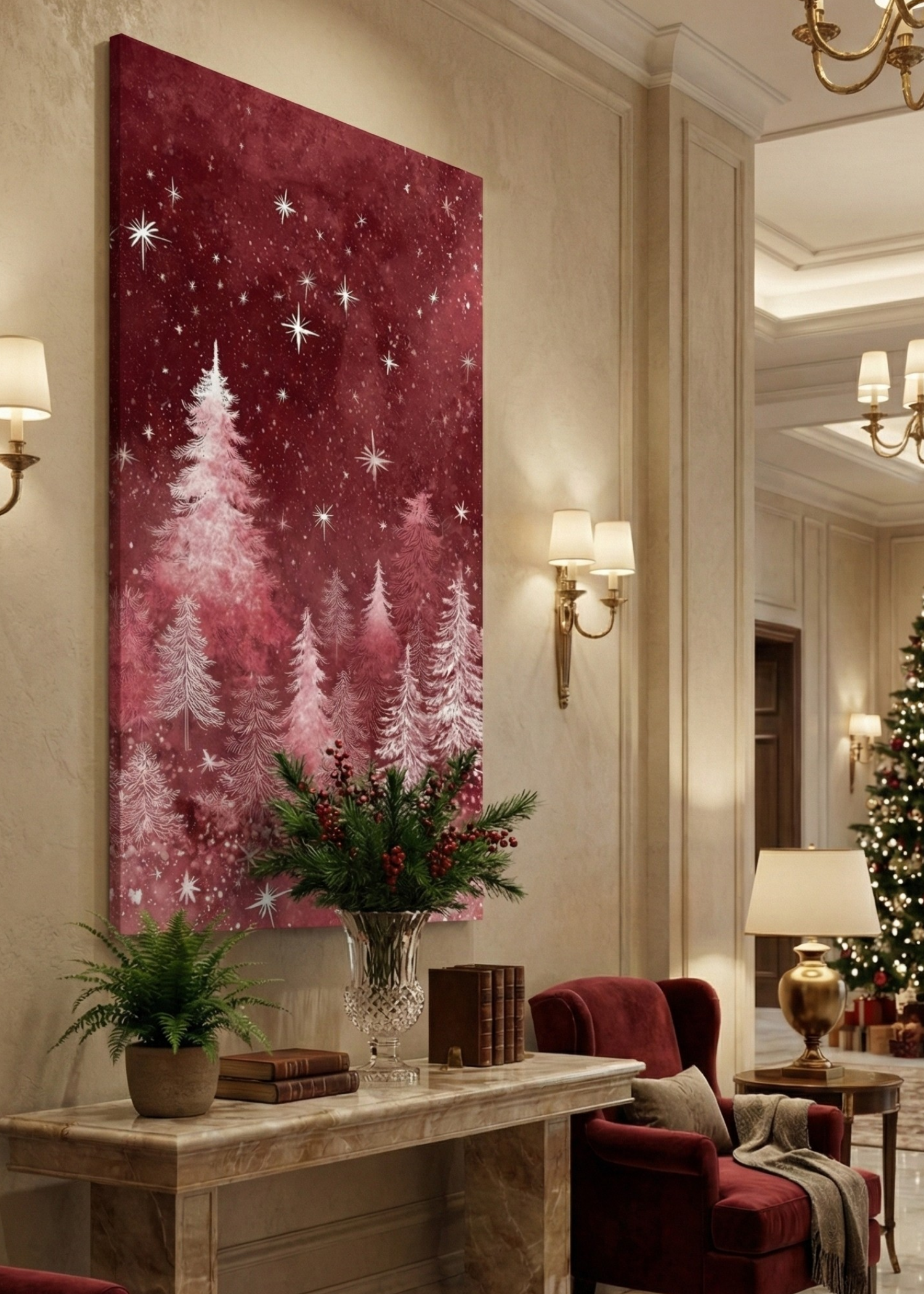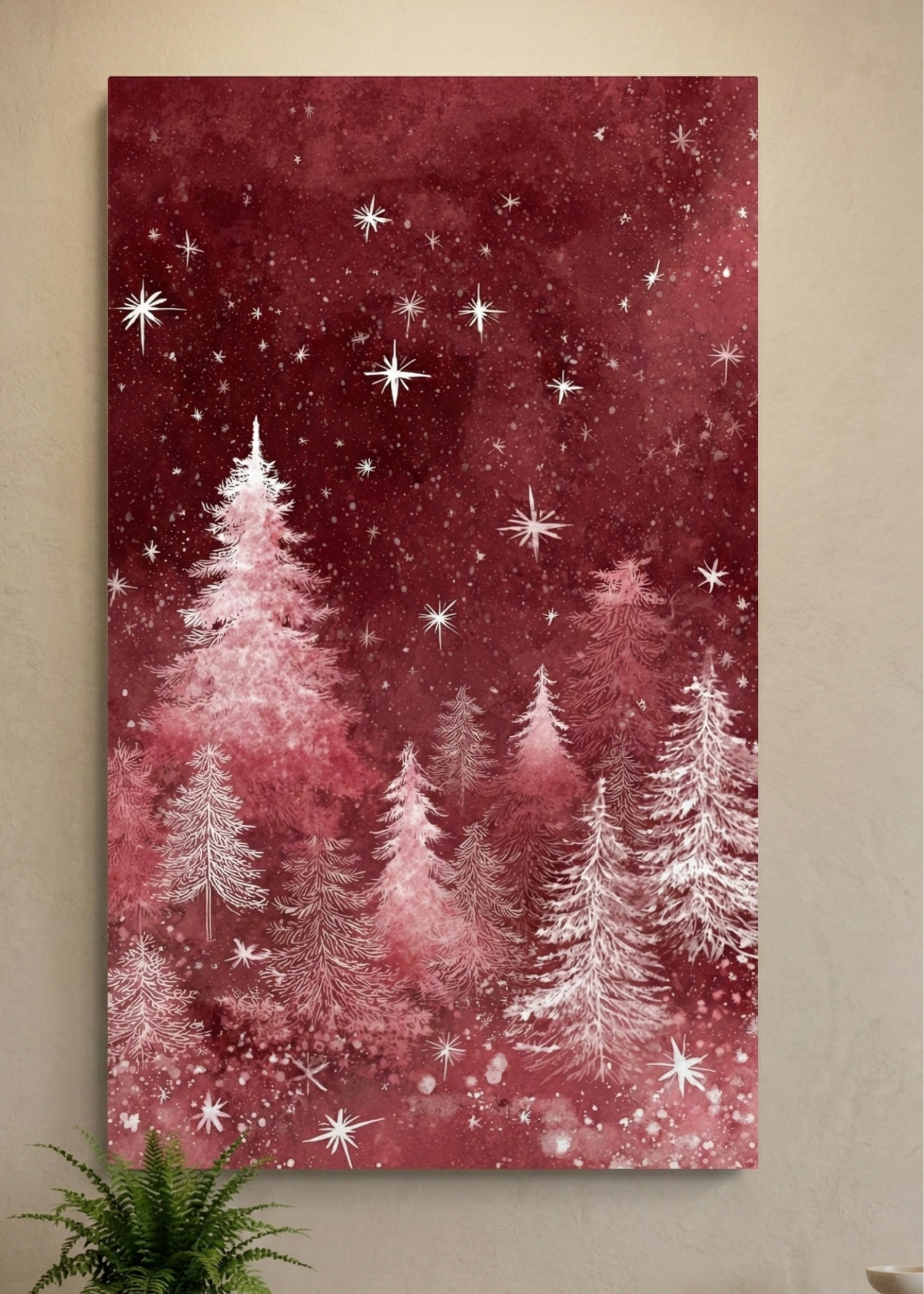 Kırmızı Yılbaşı Çam Ormanı Kanvas Tablo – Yeni Yıl Hediyesi, Noel Dekoru, Işıltılı Yılbaşı Duvar Süsü
