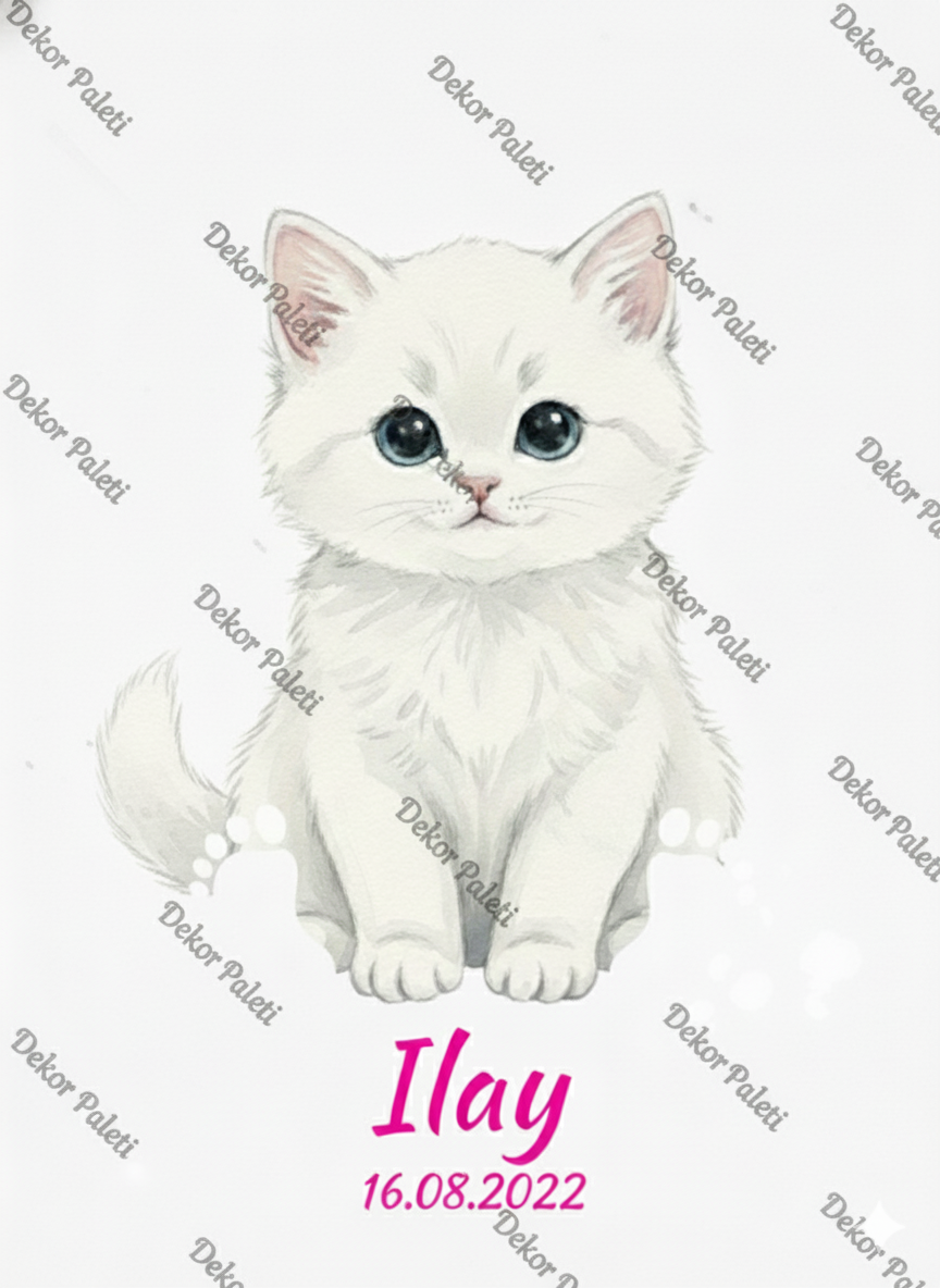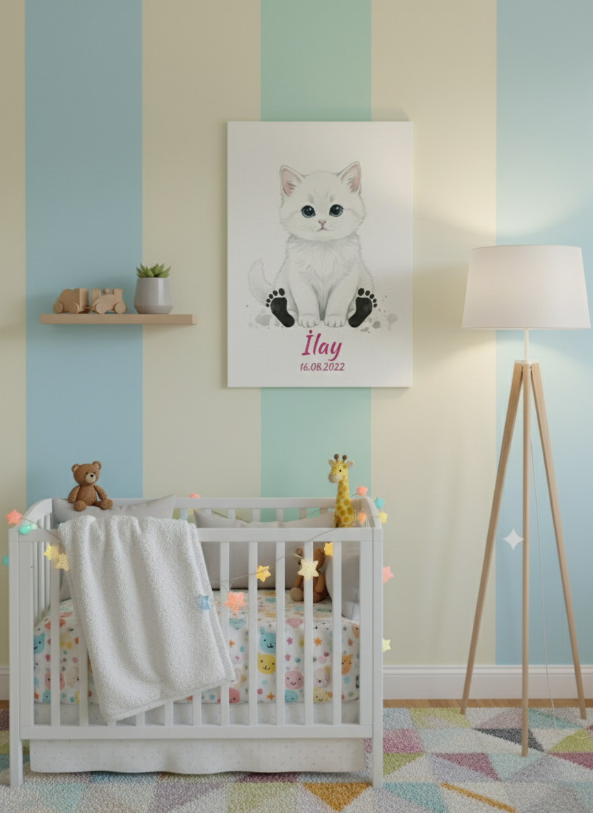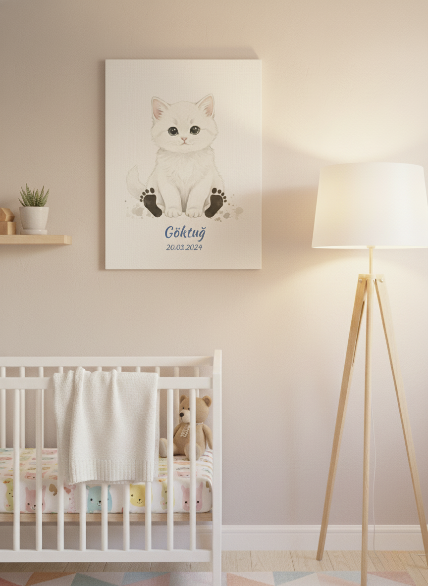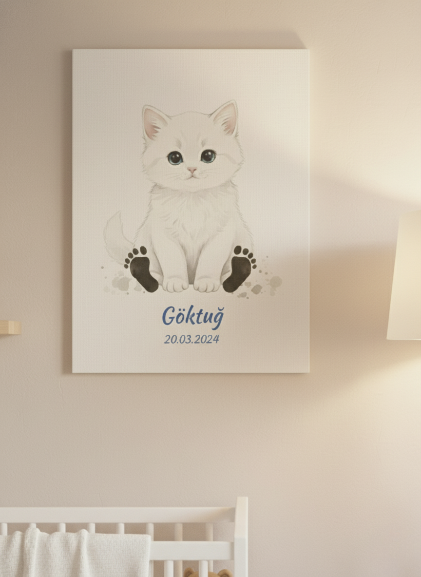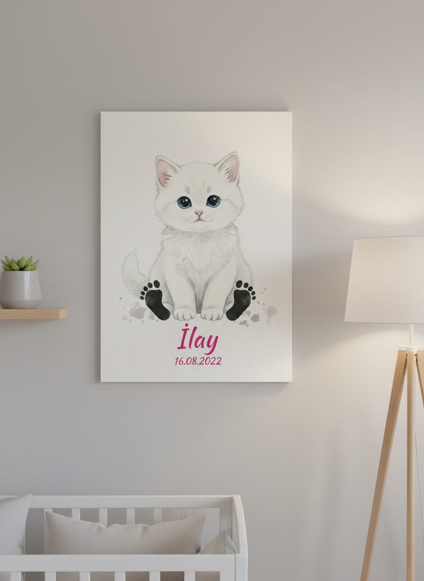 Kişiye Özel Bebek Ayak İzi Tablo Kiti – İsim ve Doğum Tarihli Hatıra Kedi Tasarımı – Boya ve Fırça Dahil Anı Tablosu