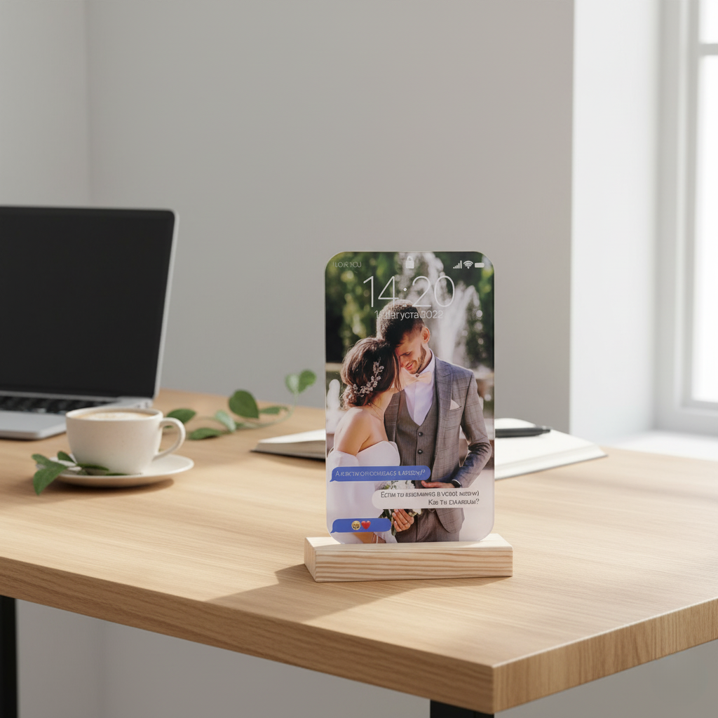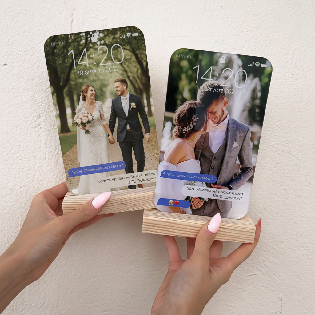 Kişiye özel akrilik telefon ekranı dekoru ile aşk hikayenizi muhteşem bir hatıraya dönüştürün! Gönderdiğiniz fotoğraf, tarih ve mesajların telefon ekranı görünümünde hazırlanmasında; ilişkinizin en özel anını modern bir dekor haline getirir. Şeffaf, parlak akrilik malzeme ve doğal ahşap standı sayesinde masaüstünde estetik bir durma sağlar. UV baskı teknolojisi ile yapılan renkli baskılar canlı, net ve solmaya karşı dayanıklıdır. Tanışma, düğün tarihi veya sevgililer günü için anlamlı bir hediye arayanlar için ideal seçimdir. Sipariş verdikten sonra fotoğraf, tarih ve mesajlarınızı iletmeniz yeterlidir; Kişiye özel olarak basılması ve basılması yoluyla gönderilir. Anahtar kelimeler: kişiye özel akrilik dekor, telefon ekranı tasarımlı akrilik, tanışma tarihi kayıtları, sevgiliye özel masa süsü, düğün hatırası dekoru, UV çıkışlı akrilik tablo.