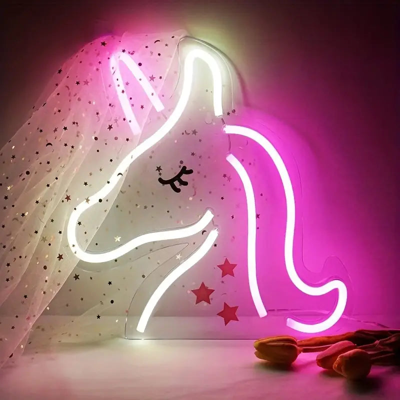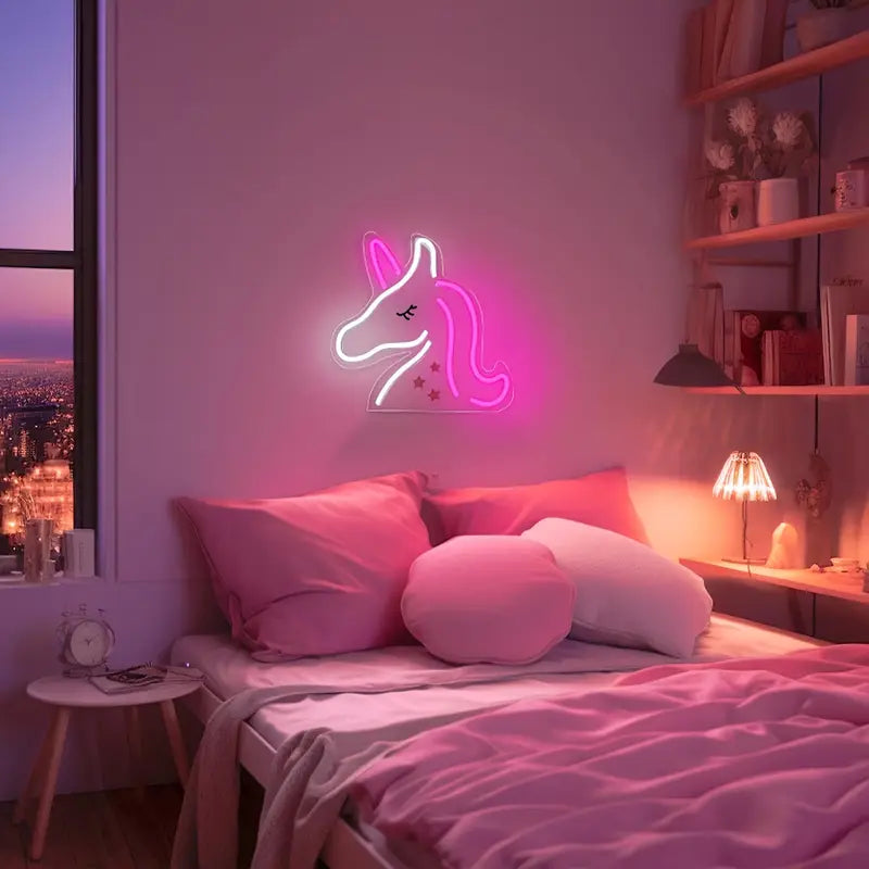 Unicorn figürü; masalları, hayalleri ve mutluluğu simgeler. Yumuşak pembe neon ışıklarıyla birleştiğinde, çocuğunuzun odasına hem huzurlu hem de büyülü bir hava katar.