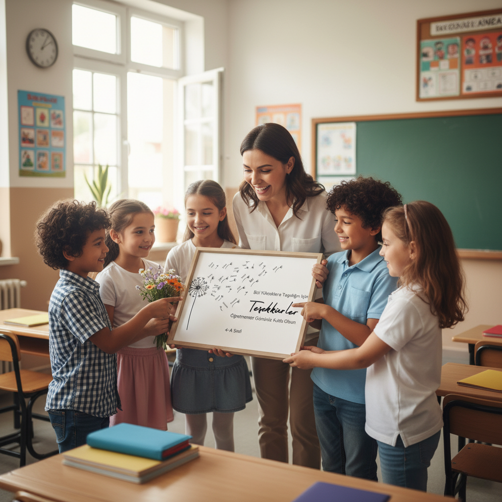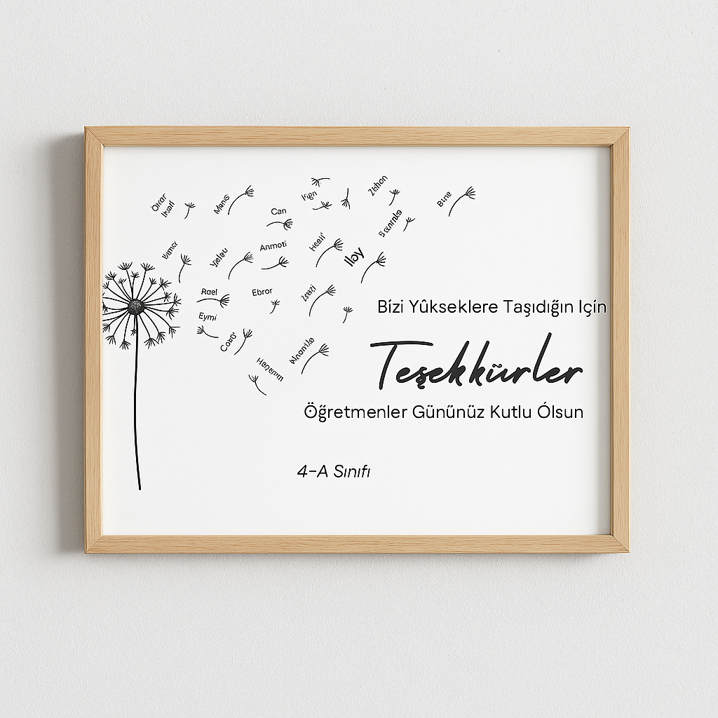 Tüm etkinliklerin isimlerinin yazılı olduğu bu özel “Teşekkürler Öğretmenim” tablosu, Öğretmenler Günü için sınıfça verilebilecek anlamlı ve muhteşem bir hediye seçeneğidir. Kişiye özel olarak hazırlanması, öğretmeninizin emeğine duygusal bir teşekkür taşır. Öğrencisinin ismi zarif bir karahindiba deseniyle tabloya işlenir ve sınıf adıyla tamamlanır. UV baskı teknolojisi sayesinde uzun ömürlü canlılığını korur. Doğal ahşap çerçevelerle her ortama uyum sağlar. Öğretmeninizin masasını ya da duvarını süsleyecek, ona baktığında yaptıklarını hatırlatacak anlamlı bir hatıra olur. Sipariş sonrasında öğrenci isimlerini ve sınıfları parçalara ayırarak mesaj yoluyla iletebilirsiniz.