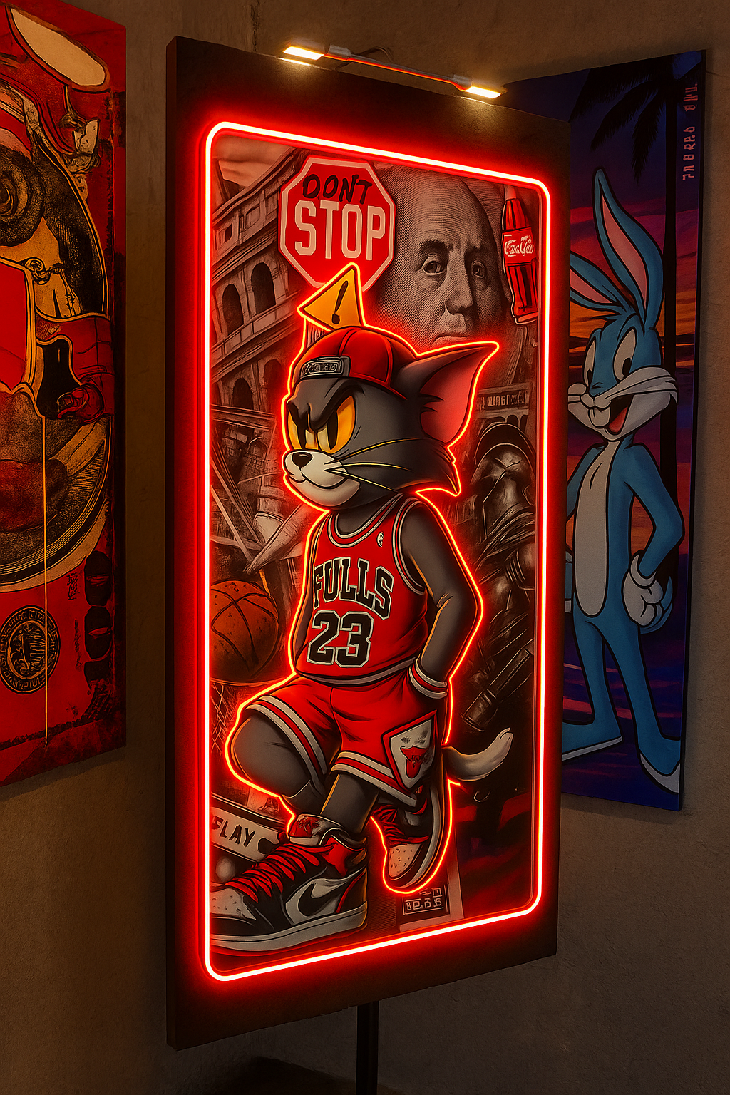 Efsane karakter Tom’un, Chicago Bulls formasıyla dinamik bir poz verdiği bu özel tasarım tablo; yüksek kaliteli pleksi malzeme üzerine işlenmiş detaylı baskı ve çevresini saran parlak kırmızı neon LED aydınlatma ile üretilmiştir. Pleksinin modern ve pürüzsüz yüzeyi, tasarımın canlı renklerini kusursuz şekilde yansıtırken neon ışık, esere derinlik ve çarpıcı bir ışıltı kazandırır. Endüstriyel, modern veya retro dekorasyon tarzlarında dikkat çekici bir odak noktası yaratır.