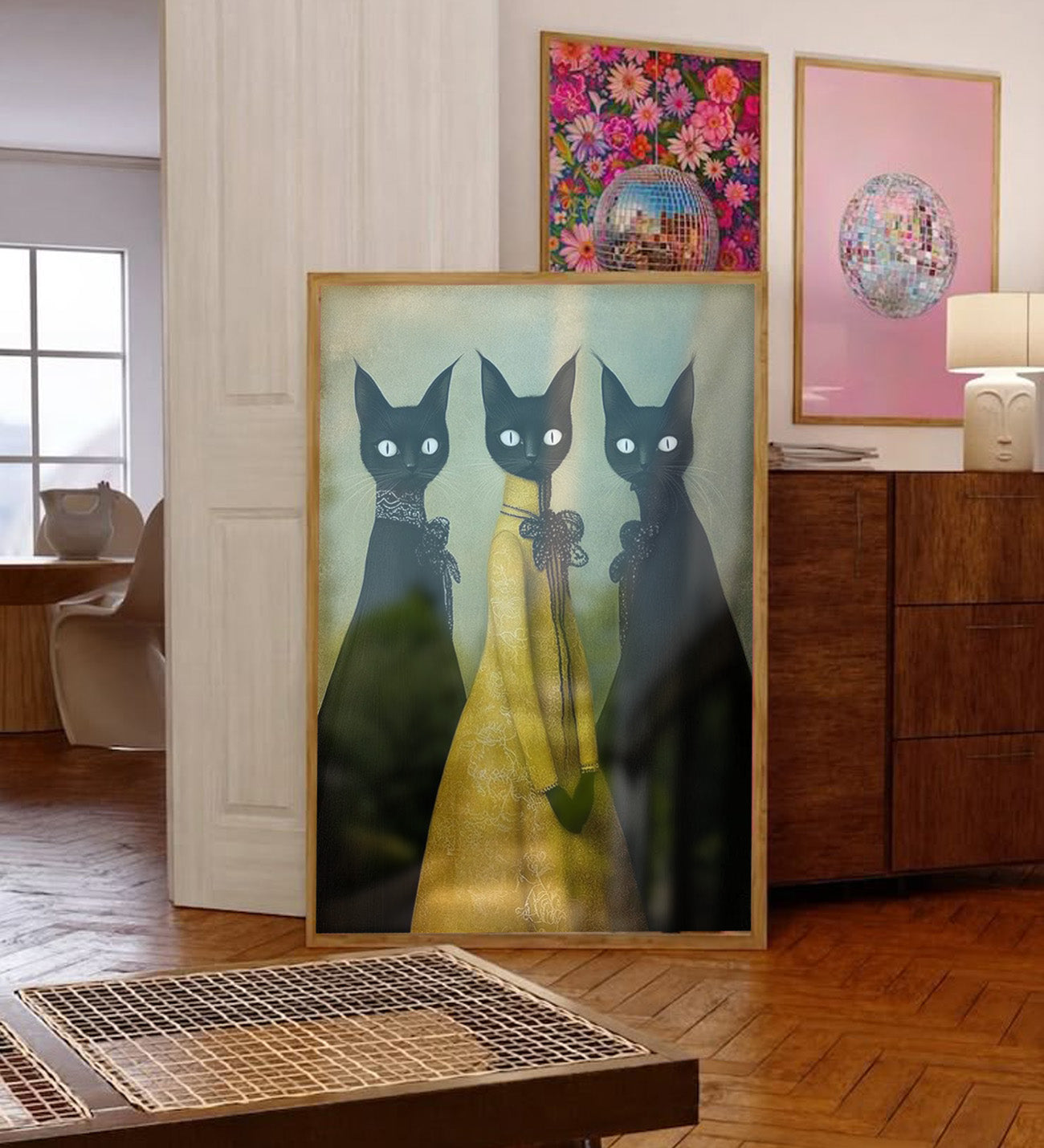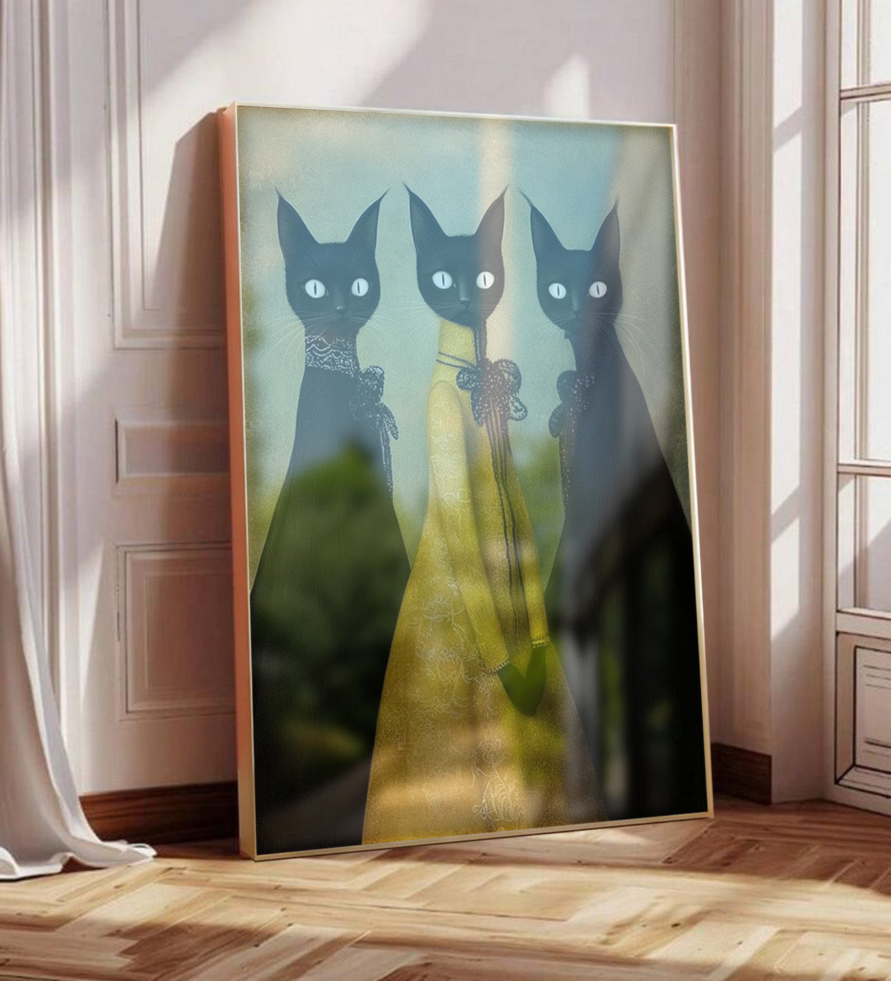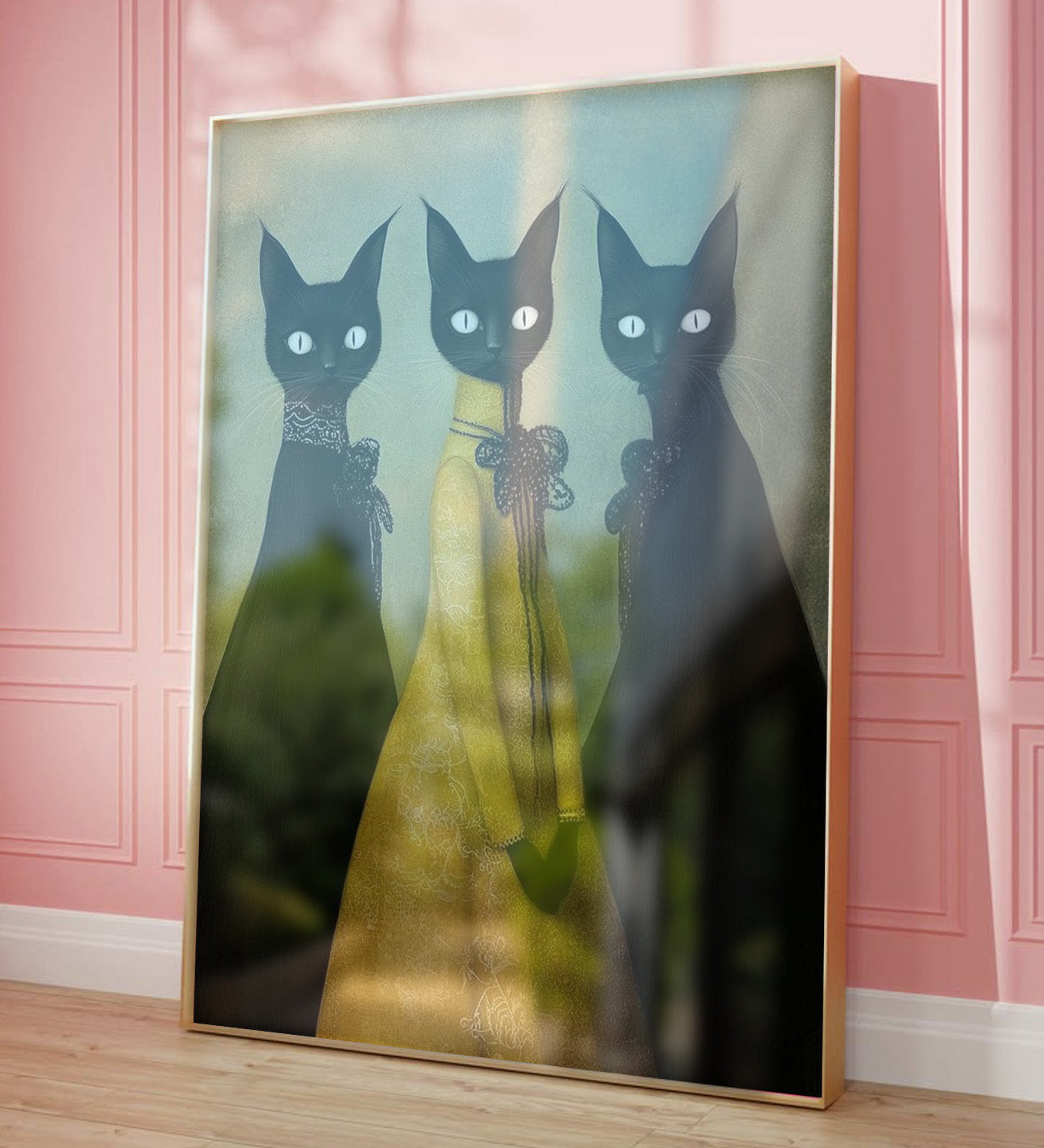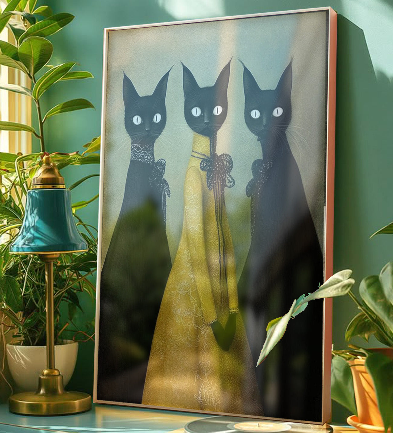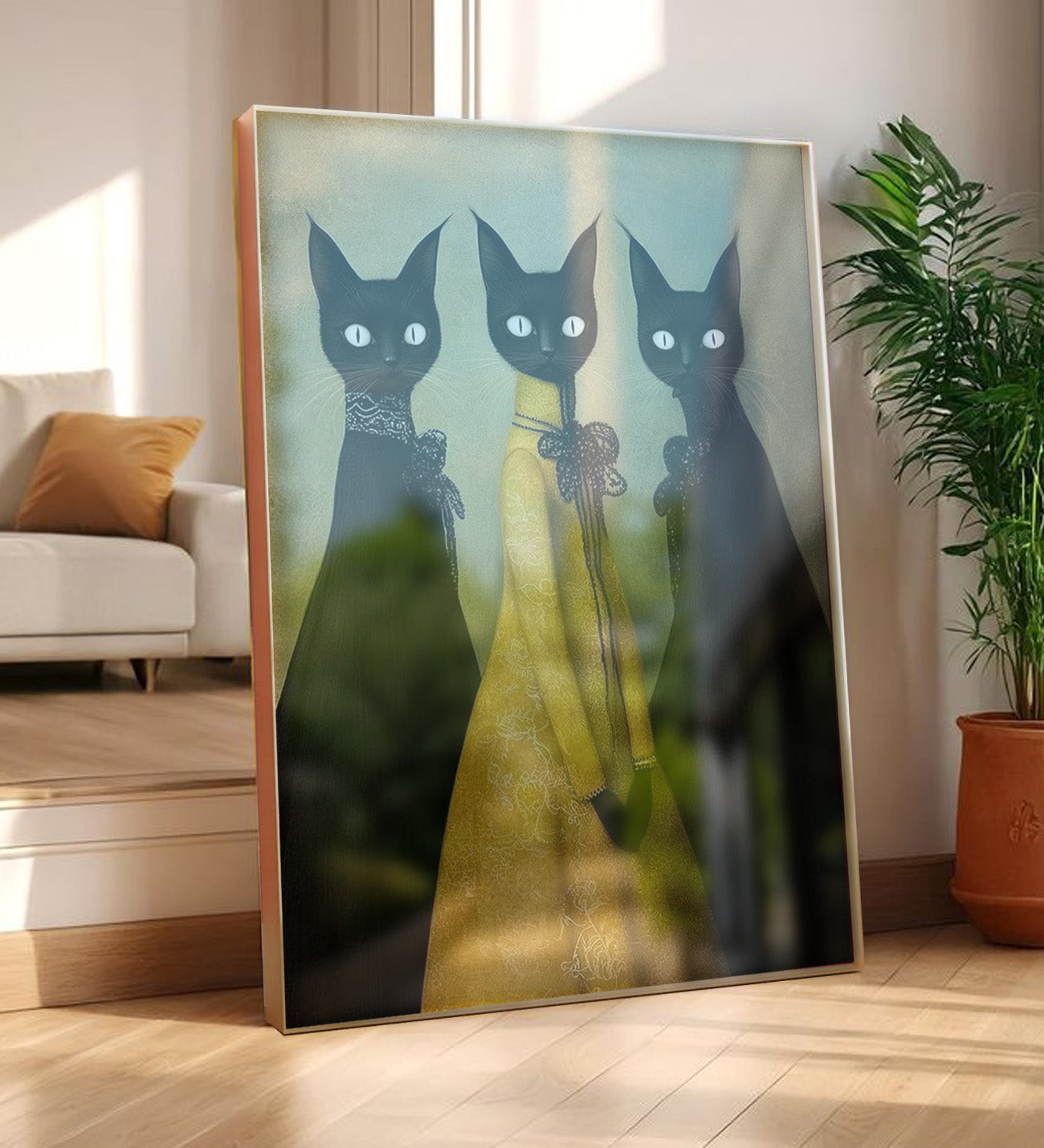 Üçlü Kedi Renkli Severlere Çerçeveli Tablo