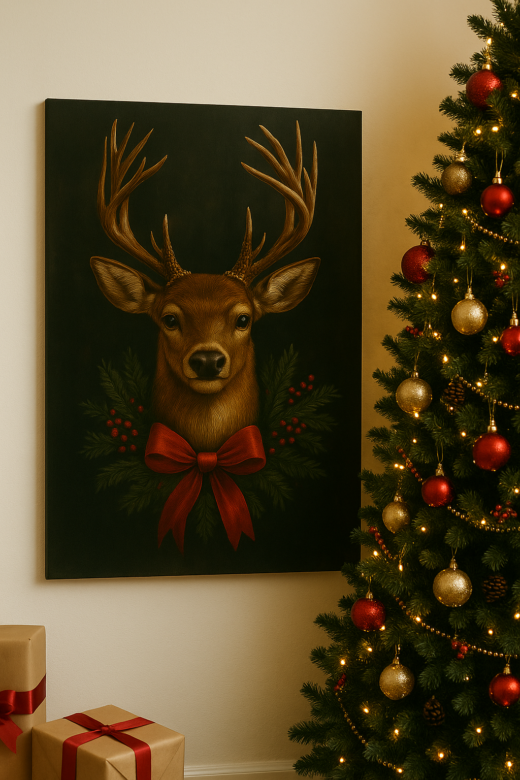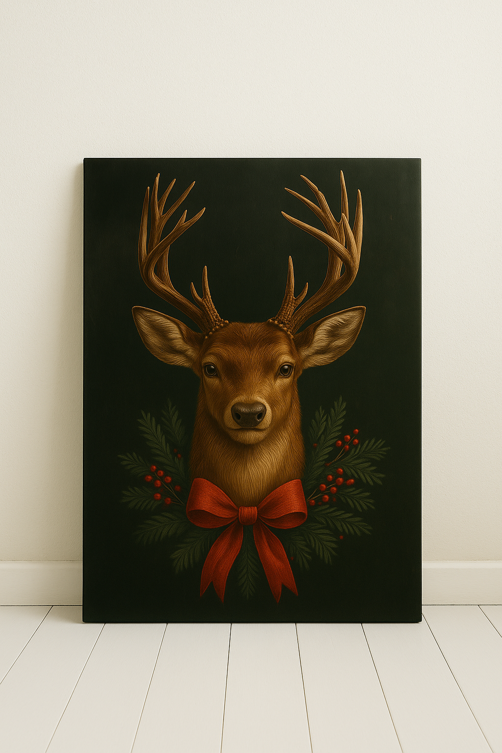 Yılbaşı Geyik Temalı Kanvas Tablo | Kırmızı Kurdeleli Yeni Yıl Duvar Dekoru